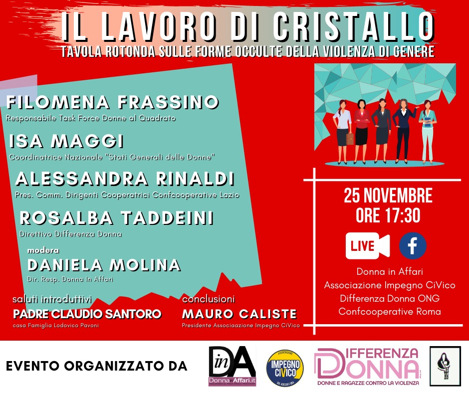 Donna in Affari, la testata giornalistica italiana specializzata nei temi del lavoro e dell’imprenditoria femminili, l’associazione Impegno CiVico e la ONG Differenza Donna, in collaborazione con la Casa Famiglia Lodovico Pavoni Onlus, in occasione della Giornata internazionale per l’eliminazione della violenza contro le donne, hanno organizzato la tavola rotonda dal titolo “Il lavoro di cristallo. Le forme occulte della violenza di genere”. Claudia Pieroni, membro della Task Force del Progetto Donne al Quadrato interverrà nella conferenza che sarà moderata da Daniela Molina, Direttrice Responsabile di Donna in Affari. Inoltre, parteciperanno alla Tavola rotonda anche Isa Maggi, Coordinatrice Nazionale de Gli Stati Generali delle Donne, Alessandra Rinaldi, Presidente della Commissione Dirigenti Cooperatrici Confcooperative Lazio e Rosalba Taddeini del Direttivo Differenza Donna. La tavola rotonda sarà in diretta streaming – dalle ore 17,30 alle ore 19,00 – in contemporanea sulle pagine social di Donna in Affari (https://www.facebook.com/donnainaffari), Impegno CiVico (https://www.facebook.com/Associazione-Impegno-CiVico-108976074319829), Differenza Donna (https://www.facebook.com/ongdifferenzadonna) e di Confcooperative Roma (https://www.facebook.com/confcooperativeroma).