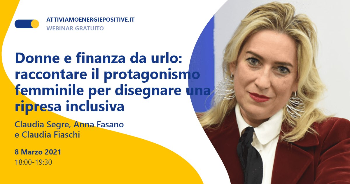 Come garantire una maggiore occupazione femminile e una sempre più piena inclusione finanziaria delle donne, anche come strumenti di contrasto alla violenza di genere? Ne parliamo l’8 marzo, in concomitanza con la Giornata Internazionale della Donna e con l’anniversario della nascita di Banca Etica, insieme a: - Anna Fasano, presidente di Banca Etica “Ricette per una finanza della parità di genere” - Claudia Segre, presidente di Global Thinking Foundation “Il ruolo dell’educazione finanziaria per l’empowerment femminile” - Claudia Fiaschi, portavoce del Forum per il Terzo Settore “Il ruolo del Terzo Settore per l’inclusione femminile”. - Modera: Morena Rossi, ideatrice di Donne da Urlo. Questo webinar fa parte del progetto Attiviamo Energie Positive, un'iniziativa di Produzioni dal Basso, in collaborazione con Banca Etica, Etica sgr e Gruppo Assimoco. - Collegati alla diretta ed interagisci su: - www.attiviamoenergiepositive.it -https://www.facebook.com/produzionidalbasso - o sulla nostra pagina facebook https://www.facebook.com/GlobalThinkingFoundation