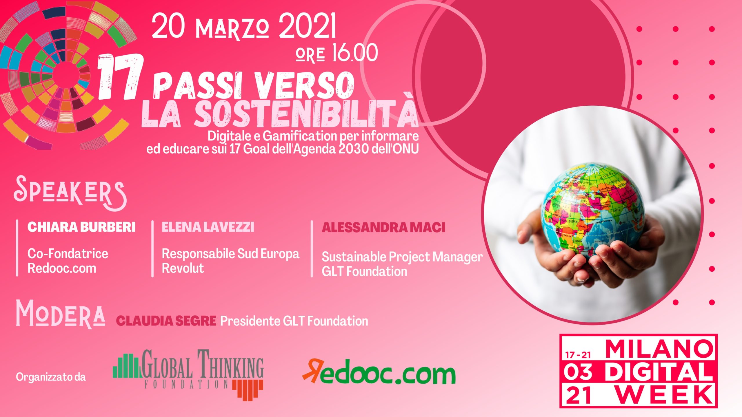Digitale e Gamification per informare ed educare sui 17 Goal dell'Agenda 2030 dell'ONU. Speakers: - Chiara Burberi: Co-Fondatrice di Redooc.com - Elena Lavezzi: Responsabile Sud Europa Revolut. - Alessandra Maci: Sustainable Project Manager Global Thinking Foundation. - Modera: Claudia Segre: Presidente Global Thinking Foundation. -Per ulteriori informazioni visita la pagina dedicata: https://www.milanodigitalweek.com/17-passi-verso-la-sostenibilita -Sarà possibile seguire l’evento: - sulla pagina Facebook di GLT - sul canale Youtube di GLT - sulla pagina Instagram di GLT