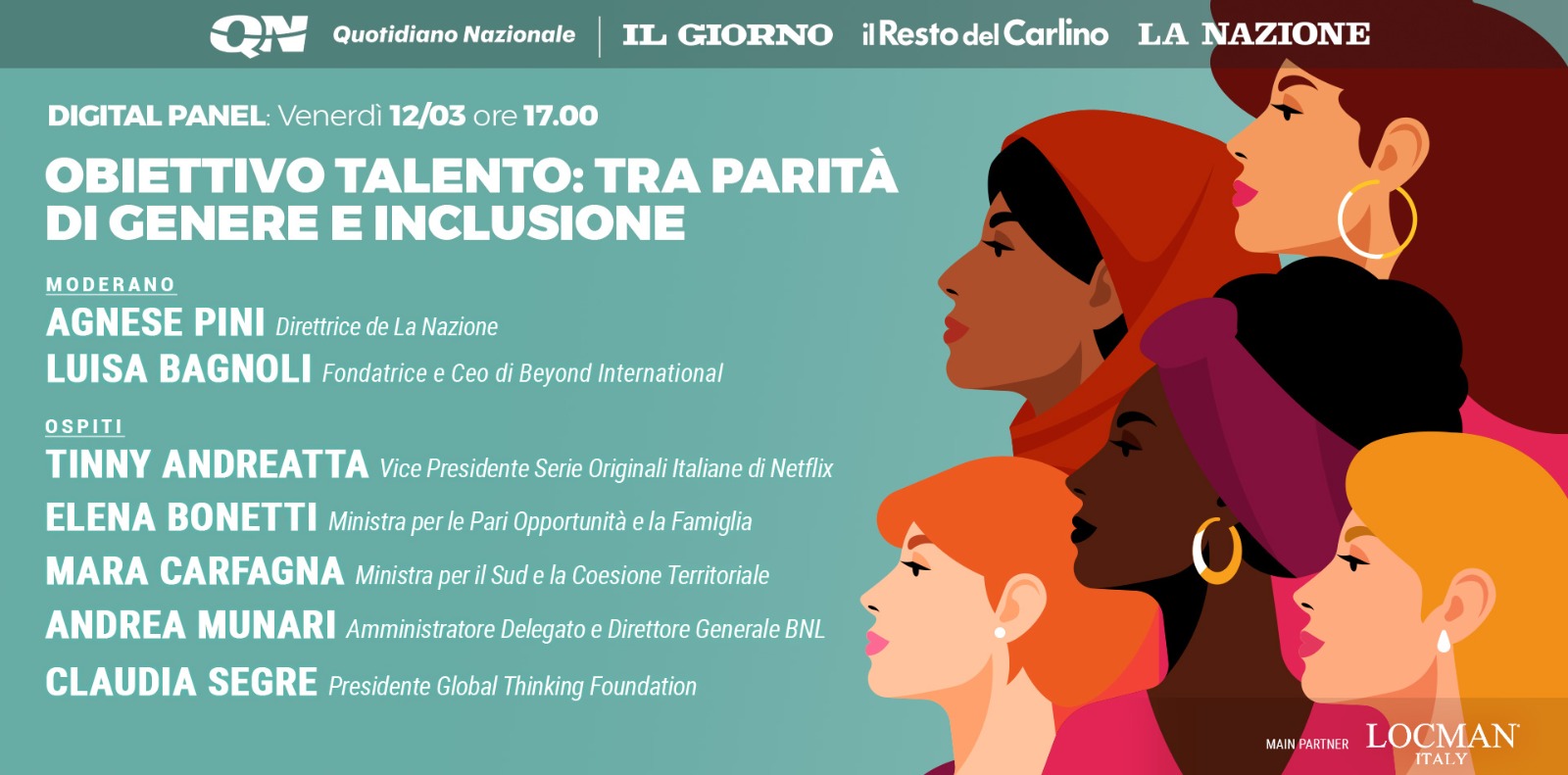 DIGITAL PANEL - OBIETTIVO TALENTO: TRA PARITÀ DI GENERE E INCLUSIONE. -MODERANO: Agnese Pini, Direttrice de La Nazione. - Luisa Bagnoli, Fondatrice e Ceo di Beyond International. -OSPITI: Tinny Andreatta, Vice Presidente Serie Originali Italiane di Netflix. -Elena Bonetti, Ministra per le Pari Opportunità e la Famiglia. -Mara Carfagna, Ministra per il Sud e la Coesione Territoriale. -Andrea Munari, Amministratore Delegato e Direttore Generale BNL. -Claudia Segre, Presidente Global Thinking Foundation. -Sarà possibile seguire l'evento sui canali social di QN e La Nazione: - www.quotidiano.net/obiettivotalento -https://www.facebook.com/QN.QuotidianoNet -https://www.facebook.com/La-Nazione-87812020989