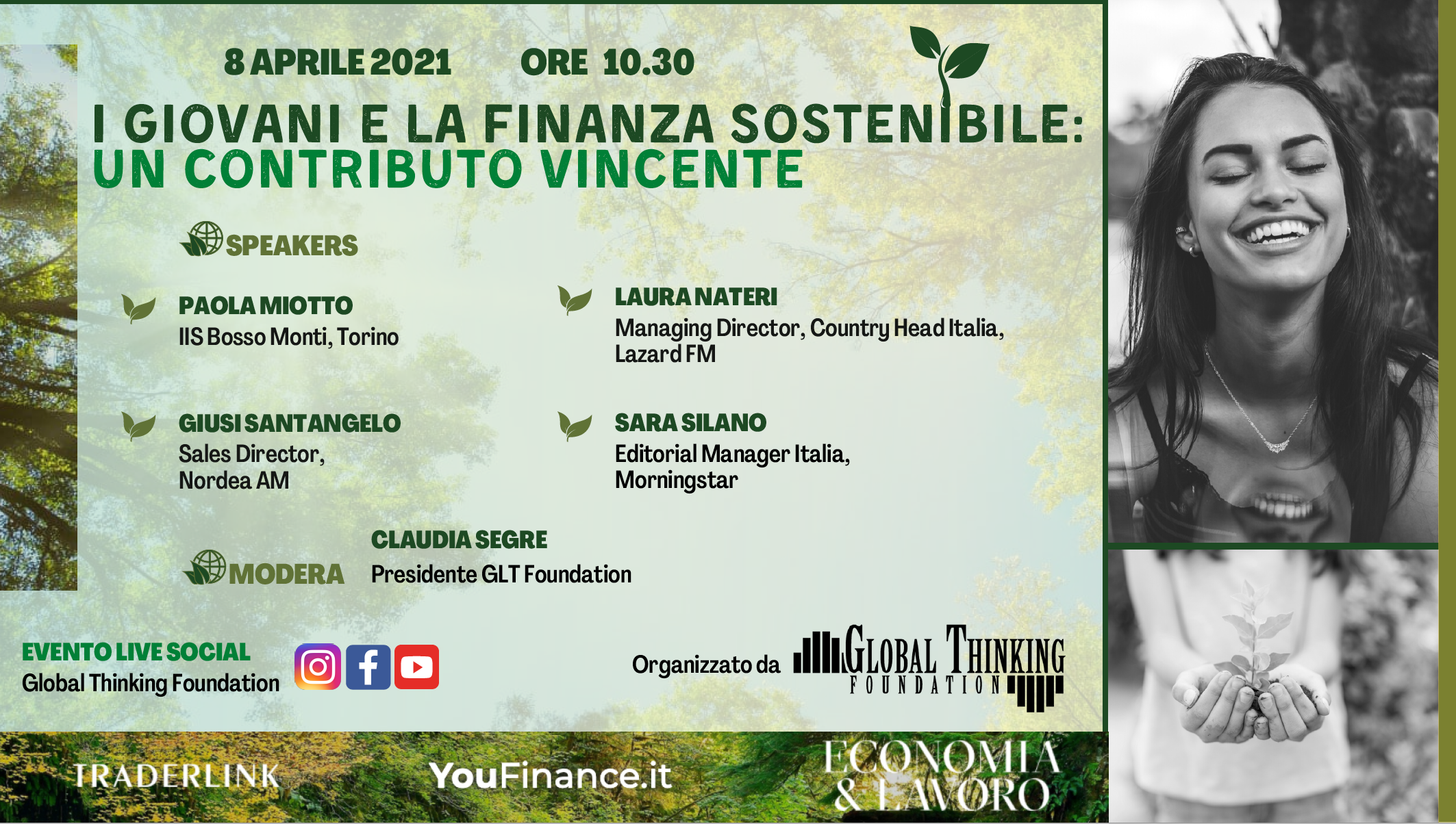 “I giovani e la finanza sostenibile: un contributo vincente” e un connubio fondamentale per il futuro. Stiamo organizzando un nuovo evento per tornare a parlare di sostenibilità e rigenerazione sociale alle nuove generazioni. Saranno loro i veri protagonisti del nostro evento del prossimo 8 aprile, organizzato in collaborazione con YouFinance.it. Speakers: - GIUSI SANTANGELO, Sales Director, Nordea AM. - LAURA NATERI, Managing Director, Country Head Italia, Lazard FM. - PAOLA MIOTTO, ISS Bosso Monti, Torino. - SARA SILANO, Editorial Manager Italia, Morningstar. MODERA: - CLAUDIA SEGRE, Presidente GLT Foundation. Sarà possibile seguire l'evento: - sulle pagine Facebook, Instagram e YouTube di Global Thinking Foundation https://www.facebook.com/GlobalThinkingFoundation https://www.instagram.com/globalthinkingfoundation/ https://www.youtube.com/channel/UCDNBF4vXJH618xaFlqdyYhw