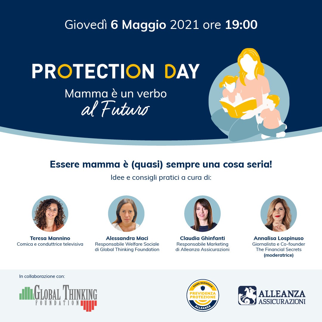 - WEBINAR in collaborazione con GLT Foundation e Alleanza Assicurazioni OSPITI: - Alessandra Maci, Responsabile Welfare Sociale Global Thinking Foundation, che ci parlerà di: pianificazione budget famigliare, edufin, protezione del risparmio in relazione all'essere mamma - Claudia Ghinfanti, Responsabile Marketing di Alleanza Assicurazioni - Teresa Maninno, Comica e Conduttrice Televisiva. MODERA: - Annalisa Lospinuso, Giornalista e Co-Founder di The Financial Secrets - Iscriviti all’evento a questo link: https://eventi.alleanza.it/protection_day - Una volta iscritto/a collegati al link che riceverai via mail per seguire l'evento in diretta!