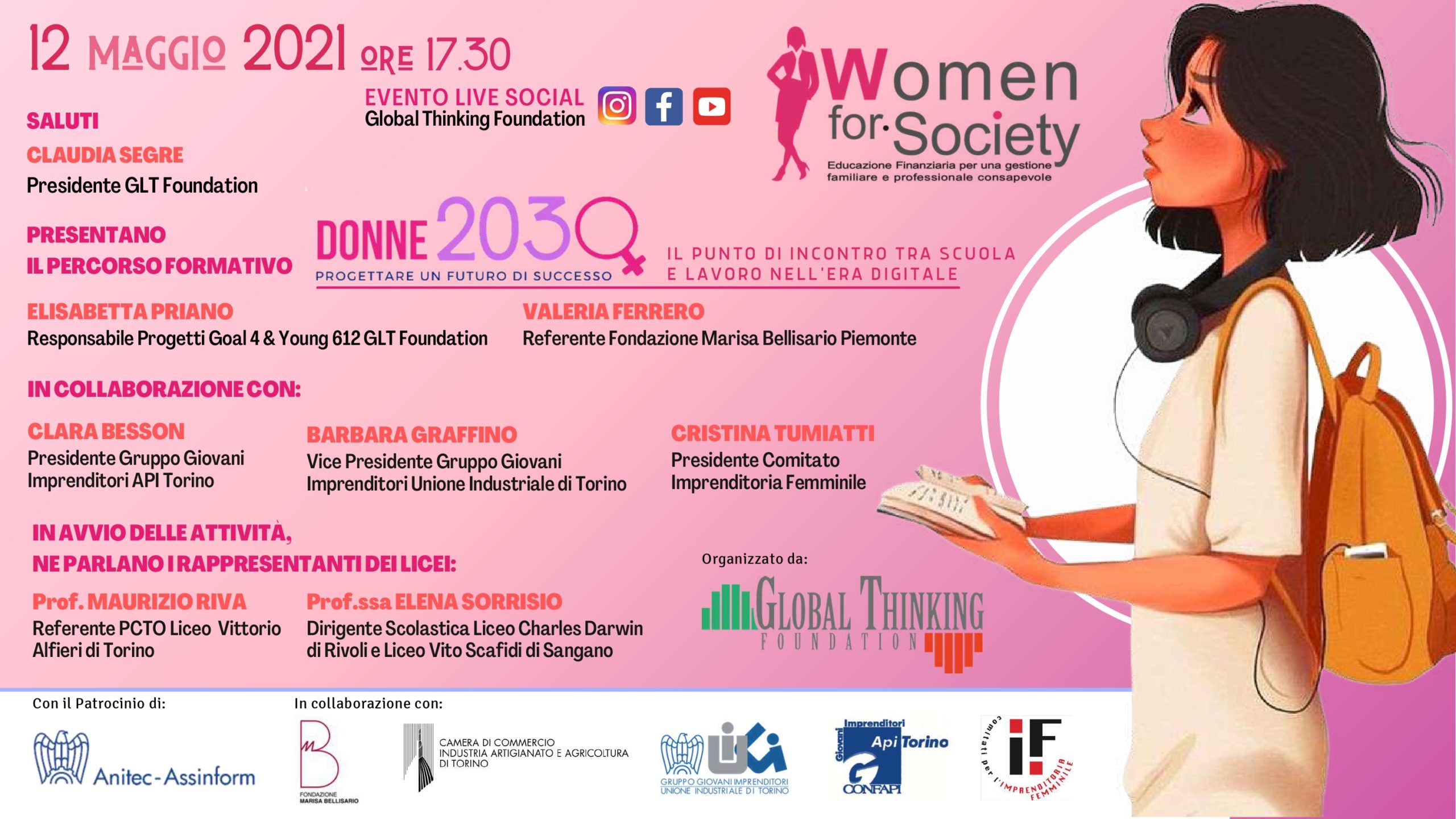 In collaborazione con Fondazione Bellisario, Camera di Commercio Torino, Gruppo Giovani Imprenditori Unione Industriale Torino, Api Torino, Comitati per l'imprenditoria femminile. Il punto d'incontro tra scuola e lavoro nell'era digitale. Vi presentiamo i corsi di Donne al Quadrato & Women4Society! Saluti: - CLAUDIA SEGRE, Presidente Global Thinking Foundation. Presentano il percorso formativo: - ELISABETTA PRIANO, Responsabile Progetti Goal 4 & Young 612 GLT Foundation. - VALERIA FERRERO, Referente Fondazione Marisa Bellisario. In collaborazione con: - BARBARA GRAFFINO, Vice Presidente Gruppo Giovani Imprenditori Unione Industriale di Torino. - CLARA BESSON, Presidente Gruppo Giovani Imprenditori API Torino. - CRISTINA TUMIATTI, Presidente Comitato Imprenditoria Femminile. In avvio delle attività, ne parlano i rappresentanti dei licei: - Prof.ssa ELENA SORRISIO, Dirigente Scolastico Liceo Charles Darwin di Rivoli e Liceo Vito Scafidi di Sangano. - Prof. MAURIZIO RIVA, Referente PCTO Liceo Vittorio Alfieri di Torino. Sarà possibile seguire l'evento sulle pagine social della Fondazione: - Facebook https://www.facebook.com/GlobalThinkingFoundation - Instagram https://www.instagram.com/globalthinkingfoundation/ - Youtube https://www.youtube.com/channel/UCDNBF4vXJH618xaFlqdyYhw