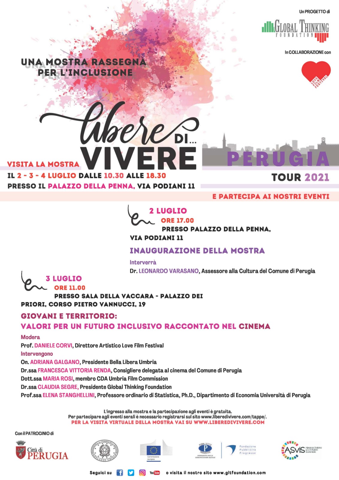Con il patrocinio della città di Perugia, Presidenza del Consiglio dei Ministri, Commissione Europea, Pubblicità Progresso e ASVIS. VISITA LA MOSTRA A PERUGIA il 2-3-4 luglio dalle 10.30 alle 18.30 presso il Palazzo della penna, Via Podiani, 11. -2 LUGLIO ORE 17.00: Inaugurazione della mostra presso Palazzo della penna, Via Podiani, 11. Interverrà: Dr. LEONARDO VARASANO, Assessore alla Cultura del Comune di Perugia. -3 LUGLIO ORE 11.00: PRESSO SALA DELLA VACCARA - PALAZZO DEI PRIORI, CORSO PIETRO VANNUCCI, 19. GIOVANI E TERRITORIO: VALORI PER UN FUTURO INCLUSIVO RACCONTATO NEL CINEMA. - Modera: Prof. DANIELE CORVI, Direttore Artistico Love Film Festival. - Intervengono: On. ADRIANA GALGANO, Presidente Bella Libera Umbria; Dr.ssa FRANCESCA VITTORIA RENDA, Consigliere delegata al cinema del Comune di Perugia; Dott.ssa MARIA ROSI, membro CDA Umbria Film Commission; Dr.ssa CLAUDIA SEGRE, Presidente Global Thinking Foundation; Prof.ssa ELENA STANGHELLINI, Professore ordinario di Statistica, Ph.D., Dipartimento di Economia Università di Perugia. L'ingresso alla mostra e la partecipazione agli eventi è gratuita. Per partecipare agli eventi serali è necessario registrarsi sul sito www.liberedivivere.com/tappe/. PER LA VISITA VIRTUALE DELLA MOSTRA VAI SU WWW.LIBEREDIVIVERE.COM