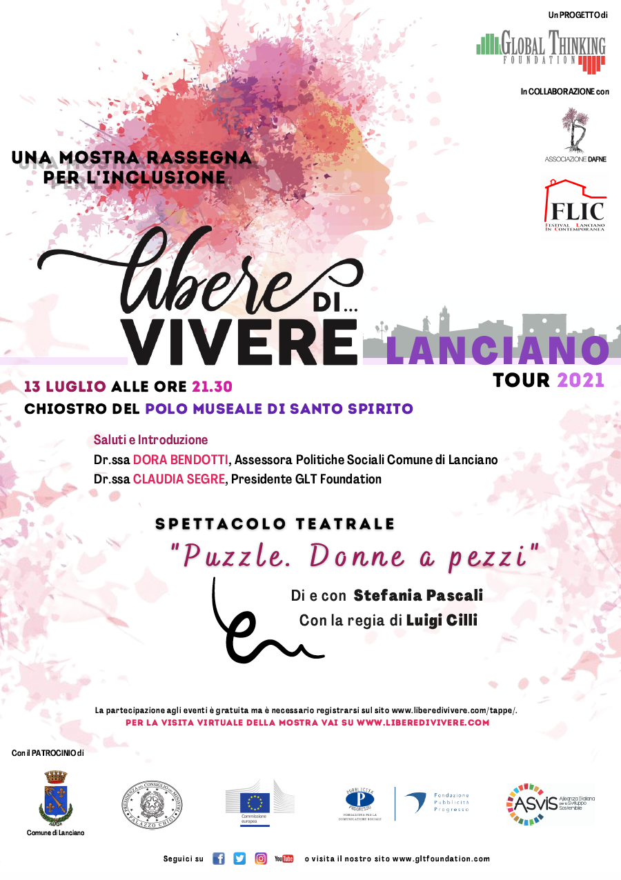 Con il patrocinio della Presidenza del Consiglio dei Ministri, Comune di Lanciano, Pubblicità Progresso, Commissione Europea, ASVIS. Saluti e Introduzione: Dr.ssa DORA BENDOTTI, Assessora Politiche Sociali Comune di Lanciano; Dr.ssa CLAUDIA SEGRE, Presidente GLT Foundation. A seguire lo spettacolo teatrale "Puzzle. Donne a pezzi" di e con Stefania Pascali, con la regia di Luigi Cilli.