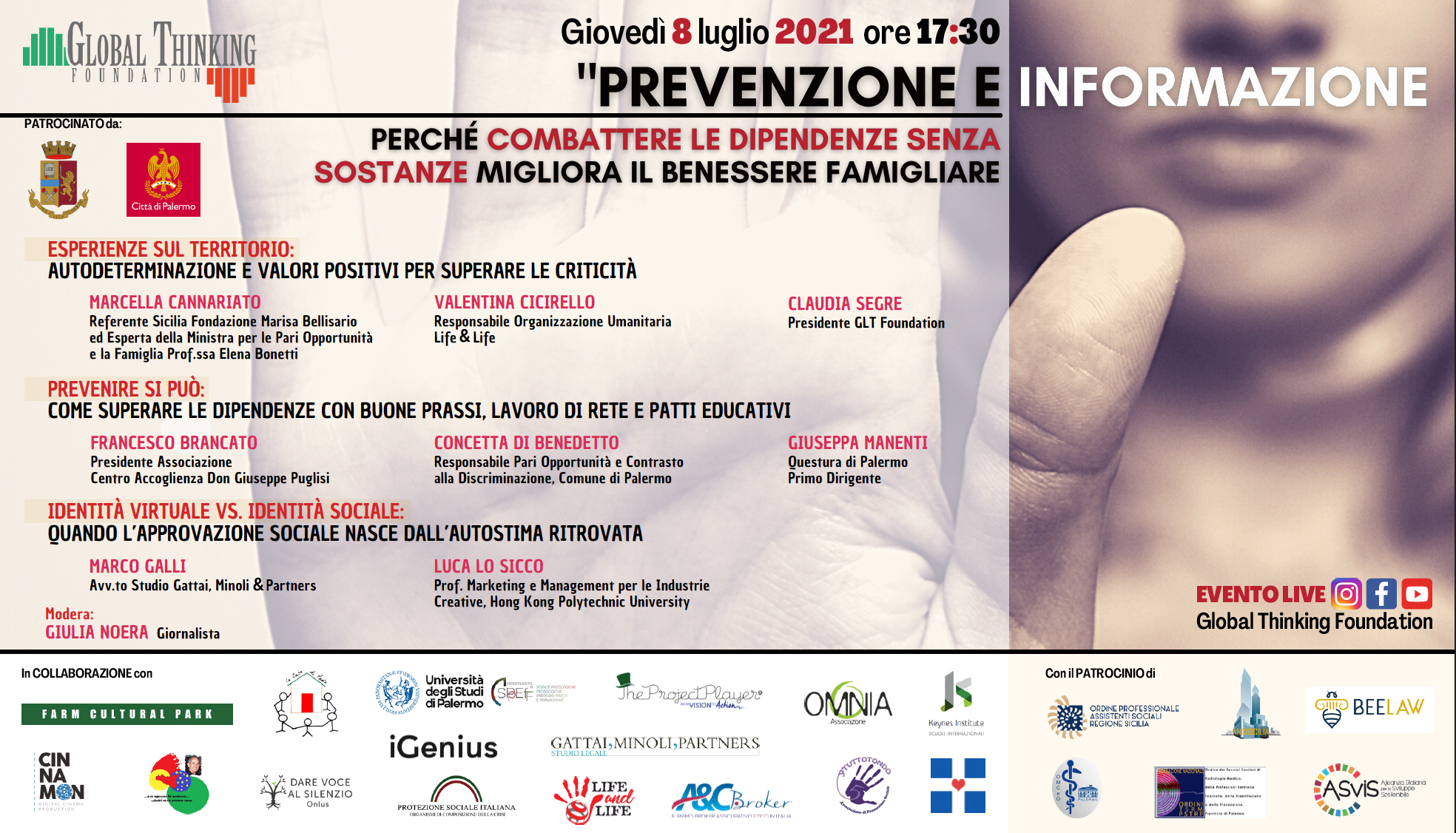 ESPERIENZE SUL TERRITORIO: AUTODETERMINAZIONE E VALORI POSITIVI PER SUPERARE LE CRITICITA'. -MARCELLA CANNARIATO: Referente Sicilia Fondazione Marisa Bellisario ed Esperta della Ministra per le Pari Opportunità e la Famiglia Prof.ssa Elena Bonetti. -VALENTINA CICIRELLO: Responsabile Organizzazione Umanitaria Life&Life. -CLAUDIA SEGRE: Presidente GLT Foundation. PREVENIRE SI PUO': COME SUPERARE LE DIPENDENZE CON BUONE PRASSI, LAVORO DI RETE E PATTI EDUCATIVI. -FRANCESCO BRANCATO: Presidente Associazione Centro Accoglienza Padre Puglisi. -CONCETTA DI BENEDETTO: Responsabile Pari Opportunità e Contrasto alla Discriminazione, Comune di Palermo. -GIUSEPPA MANENTI: Questura di Palermo Primo Dirigente. IDENTITA' VIRTUALE VS. IDENTITA' SOCIALE: QUANDO L’APPROVAZIONE SOCIALE NASCE DALL’AUTOSTIMA RITROVATA. -MARCO GALLI: Avv.to Studio Gattai, Minoli Partners. -LUCA LO SICCO: Prof. Marketing e Management per le Industrie Creative, Hong Kong Polytechnic University. -Modera: GIULIA NOERA giornalista. EVENTO LIVE SUI SOCIAL DI GLT FOUNDATION