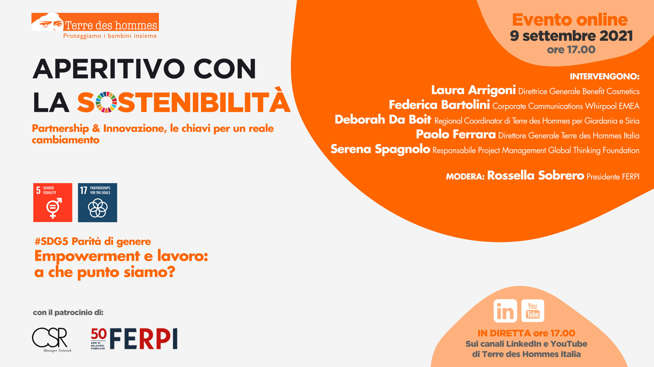 Aperitivo con la Sostenibilità - partnership e innovazione le chiavi per un reale cambiamento. 4 appuntamenti online organizzati da Terre des Hommes, con il patrocinio di CSR Manager Network e FERPI per confrontarsi sulla generazione di shared value. Gli incontri saranno trasmessi live sui canali LinkedIn e YouTube di Terre des Hommes, a partire dal 09/09 alle ore 17:00. -Giovedì 09/09 h.17:00 - #SDG5 Parità di genere – Empowerment e lavoro, a che punto siamo? Laura Arrigoni, Direttrice Generale Benefit Cosmetics; Federica Bartolini, Corporate Communications Whirpool EMEA; Deborah Da Boit, Regional Coordinator di Terre des Hommes per Giordania e Siria; Paolo Ferrara, Direttore Generale, Terre des Hommes Italia; Serena Spagnolo, Responsabile Project Management Goal 4 e 5, Global Thinking Foundation. Modera: Rossella Sobrero, Presidente FERPI .