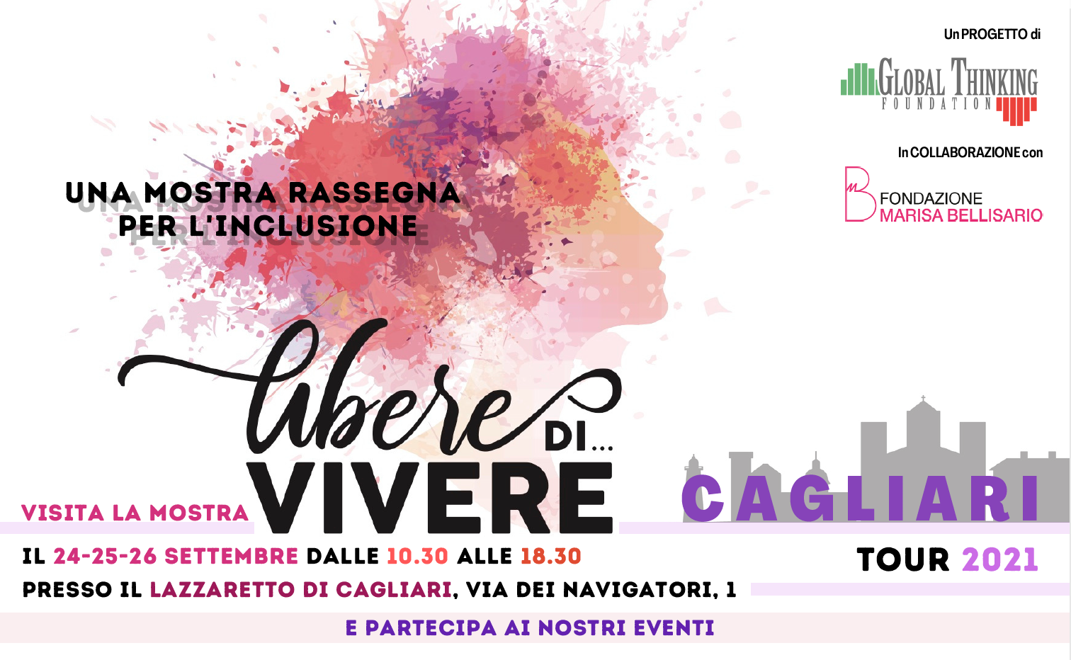 con il patrocinio di: Comune di Cagliari, Regione autonoma della Sardegna, POR FESR, Presidenza del Consiglio dei Ministri, ASVIS, Commissione Europea, Pubblicità Progresso. -24 SETTEMBRE, ORE 11.00: CONTRASTO ALLA VIOLENZA ECONOMICA E PROMOZIONE DEL BENESSERE SOCIALE PER L’INCLUSIONE FINANZIARIA. -Saluti Istituzionali: Dr. PAOLO TRUZZU, Sindaco di Cagliari; Dr. STEFANO BARRA, Direttore Sede di Cagliari Banca d'Italia. -Saluti e Introduzione: Avv. RITA DEDOLA, Assessora degli Affari Generali, Pubblica Istruzione, Politiche Universitarie e del Diritto allo Studio, Politiche Giovanili e Pari Opportunità; -Modera: Dr.ssa CLAUDIA SEGRE, Presidente GLT Foundation; -Intervengono: Dr.ssa GAVINA BRACCU, Membro Comitato Direttivo Nazionale Fipe Confcommercio e Presidente Fipe Confcommercio Olbia Gallura - Nord Sardegna; Dr.ssa SIMONA CORONGIU, Autorità Diritti e Pari Opportunità, Regione Sardegna; Dr.ssa VALERIA GANGEMI, Referente Regione Sardegna Fondazione Marisa Bellisario e Direttrice Personale & Affari Generali SO.GE.A.AL.; Prof. LUCA PIRAS, Dipartimento di Finanza Aziendale, Università di Cagliari. -24 SETTEMBRE, ORE 19.30: -Saluti Istituzionali: Dr.ssa STEFANIA LOI, Presidente della Commissione Pari Opportunità del Comune di Cagliari; Dr.ssa CLAUDIA SEGRE, Presidente GLT Foundation. SPETTACOLO TEATRALE "PUZZLE. DONNE A PEZZI" Di e con Stefania Pascali e con la regia di Luigi Cilli. L'ingresso alla mostra e la partecipazione agli eventi è gratuita. Per partecipare agli eventi serali è necessario registrarsi sul sito www.liberedivivere.com/tappe/. PER LA VISITA VIRTUALE DELLA MOSTRA VAI SU WWW.LIBEREDIVIVERE.COM