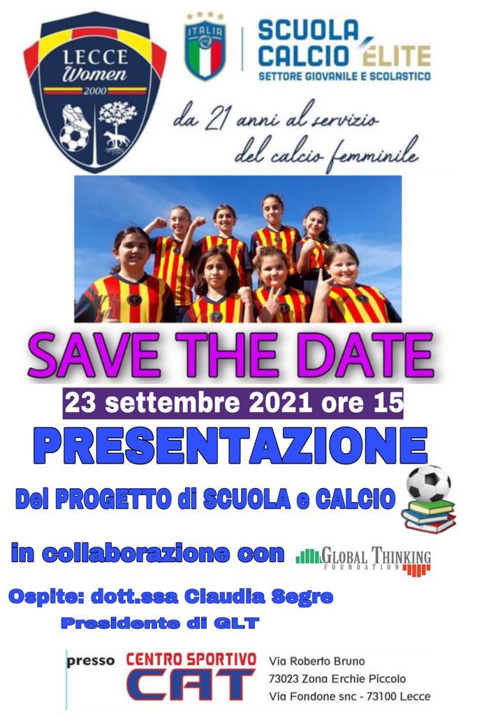 La Presidente di GLT Foundation Claudia Segre parteciperà all'evento di presentazione del progetto scuola e calcio presso il Centro Sportivo CAT a Lecce insieme a Lecce Women e Scuola Calcio Elite.