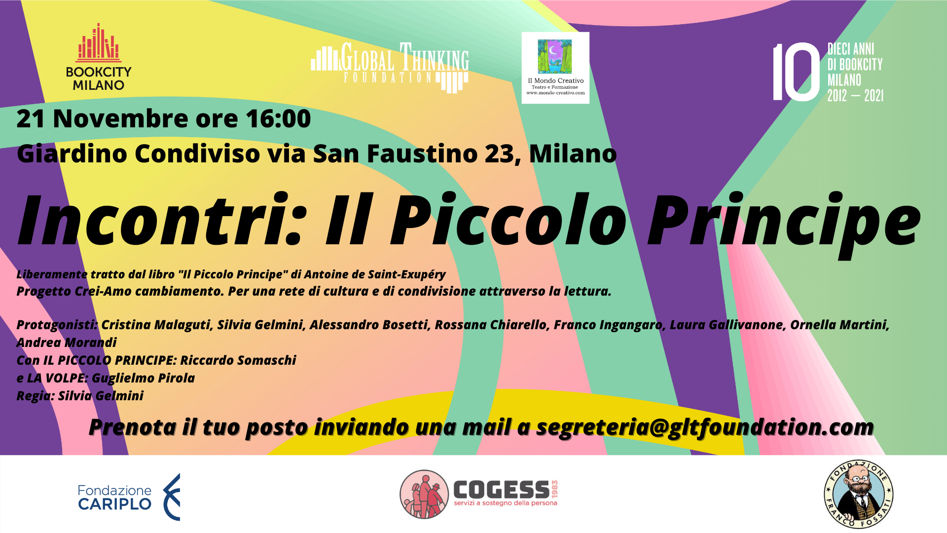 Quanto sono importanti gli incontri che facciamo? Un incontro può cambiare il corso della nostra vita? Nella cornice di Bookcity, grazie al progetto Crei-Amo cambiamento che vuole sensibilizzare grand e piccini sull'importanza del libro e della lettura, Global Thinking Foundation e Il Mondo Creativo Teatro presentano lo spettacolo "Incontri: Il Piccolo Principe". Uno spettacolo intergenerazionale, che attraverso le atmosfere magiche e impalpabili del Piccolo Principe, ci racconta una storia senza tempo che ci appartiene e mai così attuale. Un viaggio alla scoperta di sè stessi e degli altri e una serie di incontri porteranno grandi e piccini a emozionarsi insieme al Piccolo Principe e ai suoi amici. Ingresso gratuito su prenotazione scrivendo a: [email protected]. Green Pass obbligatorio. In caso di maltempo lo spettacolo si terrà alle ore 21:00 presso Wow Museo del Fumetto, Viale Campania 12, Milano.