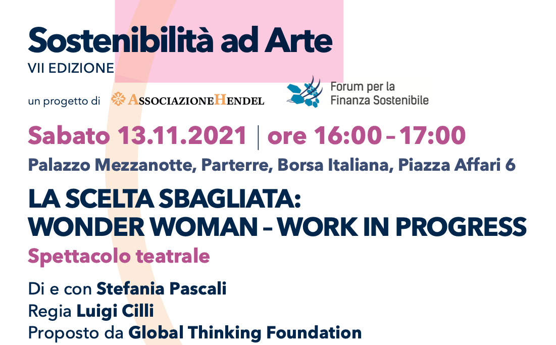 Lo spettacolo proposto questo anno da Global Thinking Foundation racconterà la storia di Stella. Stella ha una vita come tutti gli altri, con alti e bassi. All'età di trentasei anni però, si ritrova single, con due bambini e senza lavoro. Quali strategie adotterà per cavarsela? E soprattutto come risalirà la china? Una storia raccontata con ironia che insegna a non perdere mai la speranza e a credere sempre in se stessi. Spettacolo teatrale di e con Stefania Pascali. Regia di Luigi Cilli. L'evento si terrà presso la sede di Borsa Italiana - Palazzo Mezzanotte, in Piazza degli Affari 6 a Milano.