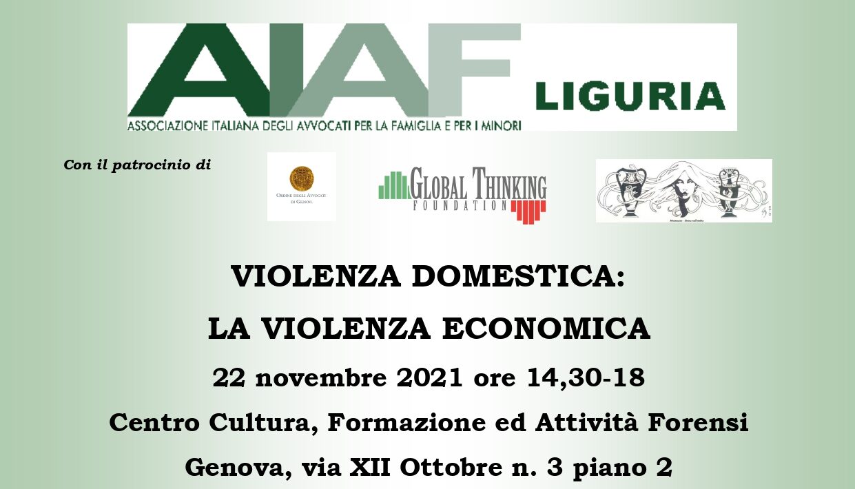 Convegno in tema di violenza domestica ed in particolare violenza economica organizzato da Aiaf Liguria con il patrocinio dell’Ordine degli Avvocati di Genova, Mnemosine donne nell’ombra e Global Thinking Foundation. Tra i relatori Claudia Segre, Presidente Global Thinking Foundation.