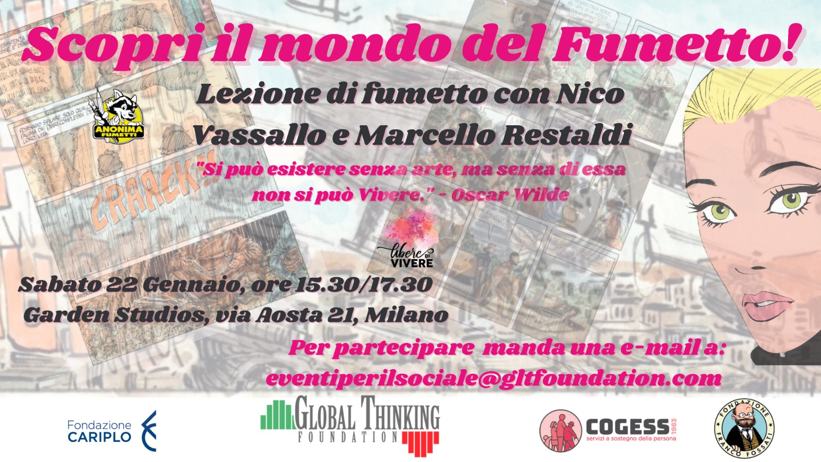 Vuoi imparare a disegnare? Vuoi scoprire il mondo del fumetto o conosci qualcuno a cui interessa? Non farti sfuggire il nostro imperdibile evento gratuito! Sabato 22 Gennaio, dalle 15:30 alle 17:30. Una lezione di fumetto con due professionisti del settore: Nico Vassallo (Vicepresidente Anonima Fumetti) e Marcello Restaldi (disegnatore e fumettista) terranno una lezione di fumetto per voi presso Garden Studios, via Aosta 21, Milano. Iscriviti con un click! Mandaci una mail a: [email protected] Vi aspettiamo: giovani e non, appassionati, curiosi e/o veterani del mondo del fumetto. Un'occasione imperdibile (e gratuita!) L'evento fa parte del progetto "Crei-amo cambiamento", sostenuto da Fondazione Cariplo, in collaborazione con Fondazione Franco Fossati, Cogess.