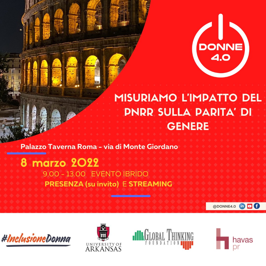 Donne protagoniste di un'Italia coraggiosa, digitale ed inclusiva. Un incontro in cui potersi confrontare con rappresentanti del Governo, degli atenei, di fondazioni e di altre associazioni e condividere i prossimi passi. In particolare, nel convegno saranno anche oggetto di approfondimento modelli e strumenti di misurazione, la certificazione di genere, insieme ai risultati del W20 Italy. Sarà presente anche la nostra Presidente Claudia Segre. Sarà possibile seguire l'evento sui canali LinkedIn, YouTube e Facebook di Donne4.0.
