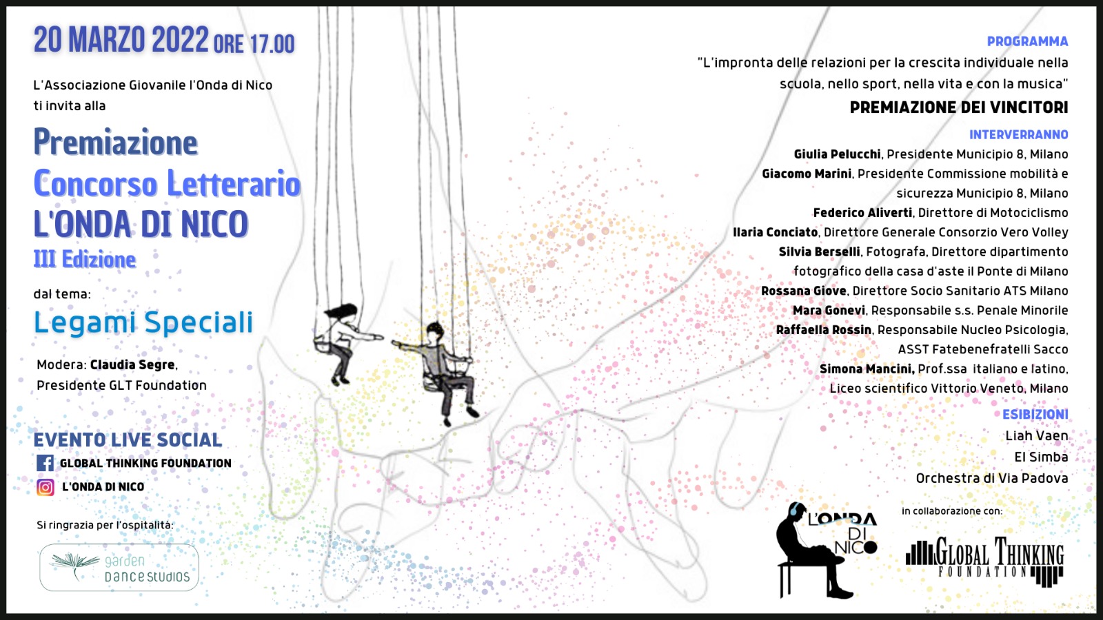 PREMIAZIONE CONCORSO LETTERARIO "L'ONDA DI NICO" - III EDIZIONE dal tema Legami Speciali. Modera Claudia Segre, Presidente GLT Foundation. L'evento sarà trasmesso in diretta sulla pagina Facebook di GLT Foundation e sulla pagina Instagram di L'onda di Nico.
