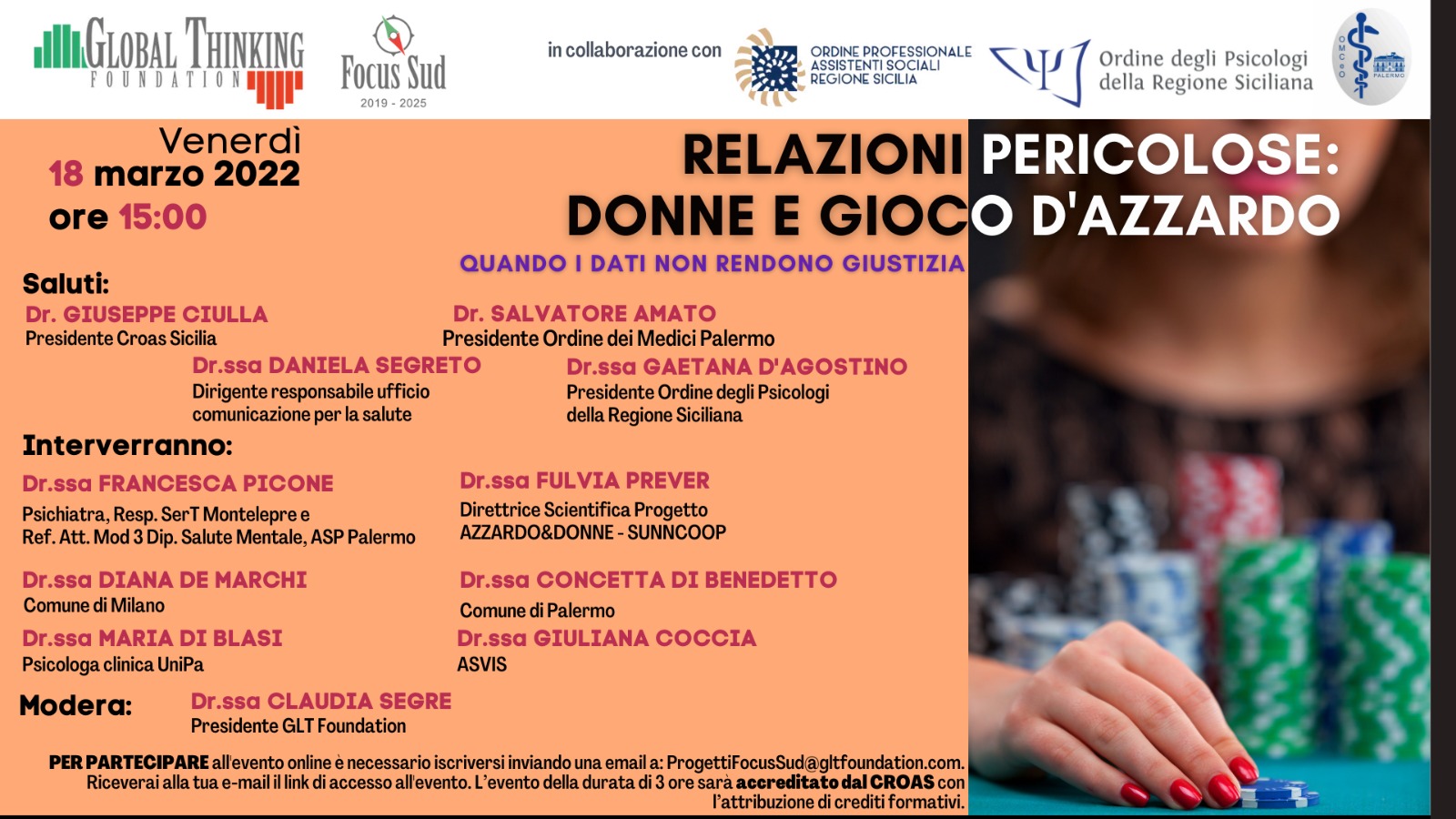 RELAZIONI PERICOLOSE: DONNE E GIOCO D'AZZARDO - QUANDO I DATI NON RENDONO GIUSTIZIA. Saluti: -Dr. GIUSEPPE CIULLA Presidente Croas Sicilia. -Dr.ssa DANIELA SEGRETO Dirigente responsabile ufficio comunicazione per la salute. -Dr. SALVATORE AMATO Presidente Ordine dei Medici Palermo. -Dr.ssa GAETANA D'AGOSTINO Presidente Ordine degli Psicologi della Regione Siciliana. INTERVERRANNO: -Dr.ssa FRANCESCA PICONE Psichiatra, Resp. SerT Montelepre e Ref. Att. Mod 3 Dip. Salute Mentale, ASP Palermo. -Dr.ssa FULVIA PREVER Direttrice Scientifica Progetto AZZARDO&DONNE - SUNNCOOP. -Dr.ssa DIANA DE MARCHI Comune di Milano. -Dr.ssa MARIA DI BLASI Psicologa clinica UniPa. -Dr.ssa CONCETTA DI BENEDETTO Comune di Palermo -Dr.ssa GIULIANA COCCIA ASVIS. MODERA: -Dr.ssa CLAUDIA SEGRE: Presidente GLT Foundation. PER PARTECIPARE all'evento online è necessario iscriversi inviando una mail a: [email protected]. Riceverai il link di accesso all'evento. L'evento della durata di 3 ore sarà accreditato dal CROAS con l'attribuzione di crediti formativi.
