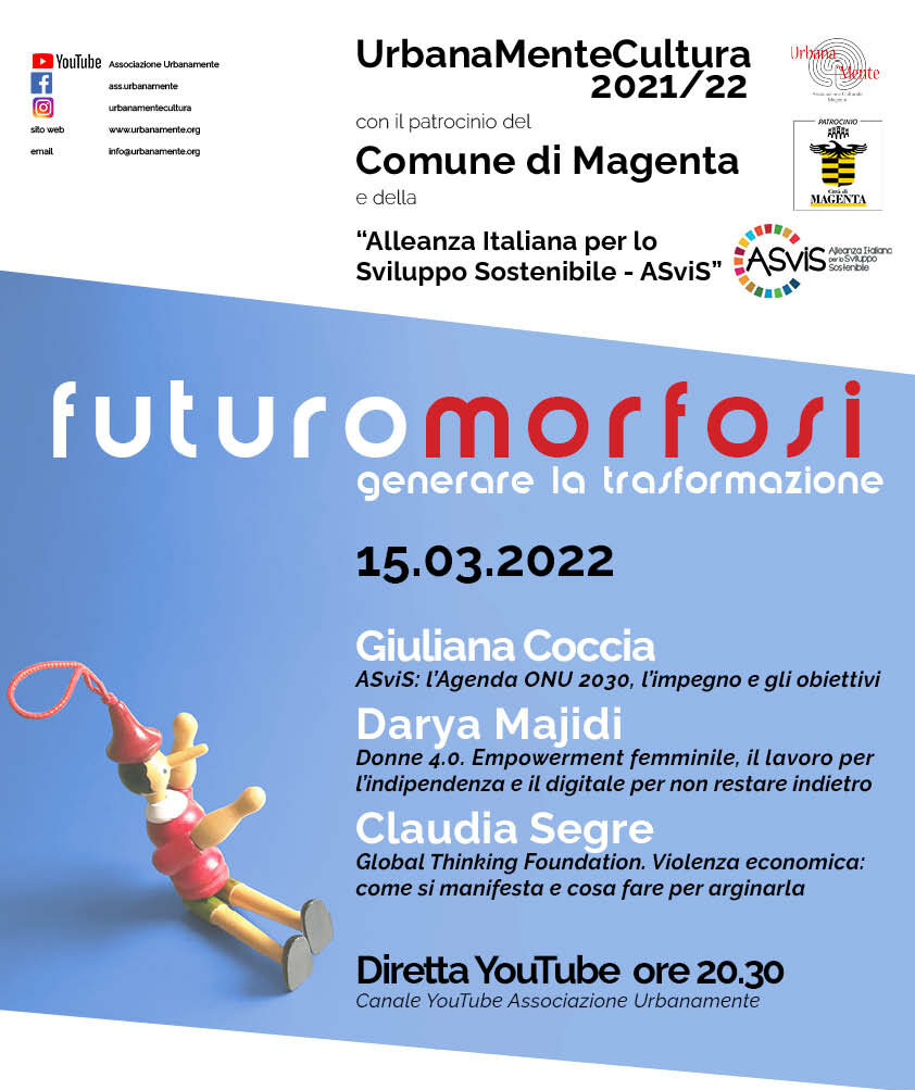 Empowerment è la parola chiave del prossimo e ultimo incontro del ciclo sul tema “Futuromorfosi. Generare la trasformazione”. Empowerment indica un processo di crescita personale, la conquista della consapevolezza di sé e del controllo sulle proprie scelte, decisioni e azioni, nell’ambito delle relazioni personali e in quello della vita politica e sociale. Questo processo porta ad un rovesciamento del senso comune dell’esercizio del potere e spinge a fare il punto sui propri limiti in vista del raggiungimento di risultati oltre proprie aspettative. L’incontro si suddividerà in tre sezioni tra loro interdipendenti, ognuna curata da una relatrice esperta nel tema, in particolare: - Giuliana Coccia, ex dirigente di ricerca presso l’Istat e autrice di numerosi articoli scientifici e monografie, membro dell’International statistical institute, dell’Associazione di statistica applicata e della Società italiana di statistica, ci guiderà alla conoscenza dell’Agenda ONU 2030, dell’attività e della missione di Asvis tesa al raggiungimento dei 17 SDGs. - Darya Majidi, imprenditrice, founder & CEO di Daxo Group, società di consulenza strategica in Industria 4.0, laureata in informatica, master in economia e in leadership femminile alla Yale University, autrice dei libri “Donne 4.0”, “Sorellanza Digitale e “Connected Sisterhood”, affronterà il tema dell’empowerment femminile nell’ambito del lavoro, quale indispensabile strumento per l'indipendenza, e la competenza tecnologica per non restare indietro. - Claudia Segre, trader e manager, laureata in International Economics, ha lavorato presso primarie Banche italiane per oltre 30 anni e collaborato con varie Università e Fondazioni per diffondere l’importanza della cultura economica e finanziaria, e ci presenterà un fenomeno di cui si parla poco: la violenza economica, come si manifesta, cosa fare per arginarla, come difendersi. Vi aspettiamo online, martedì 15 marzo, ore 20.30, in diretta sul canale youtube Associazione Urbanamente. Link: https://www.youtube.com/channel/UCI99Wzda-K4_dA58KKN1TfQ