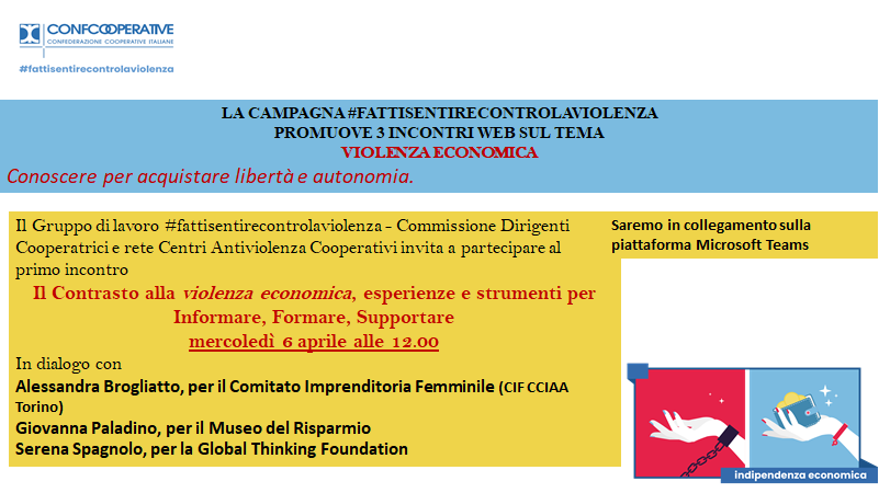 La campagna #fattisentirecontrolaviolenza promuove tre incontri web sul tema della violenza economica. Il primo si terrà mercoledì 6 aprile dalle ore 12.00 in un dialogo con Alessandra Brogliatto del Comitato per la promozione dell'imprenditoria femminile della Camera di Commercio di Torino, Serena Spagnolo della Global Thinking Foundation di Milano e Giovanna Paladino del Museo del Risparmio di Torino. Qui il link per alla piattaforma Microsoft Teams https://teams.microsoft.com/l/meetup-join/19%3ameeting_NDVmYmQ4YWItYzg0OS00NDNlLWFmY2ItZDczZDgyZDM1NWM1%40thread.v2/0?context=%7b%22Tid%22%3a%229bc38d7a-8fce-4914-af08-4baaf65c05f9%22%2c%22Oid%22%3a%223d1c0f83-728f-4150-827c-728f57ce59d3%22%7d L'EVENTO SARA' ANCHE REGISTRATO E PUBBLICATO SULLA PAGINA FACEBOOK DELLA COMMISSIONE.