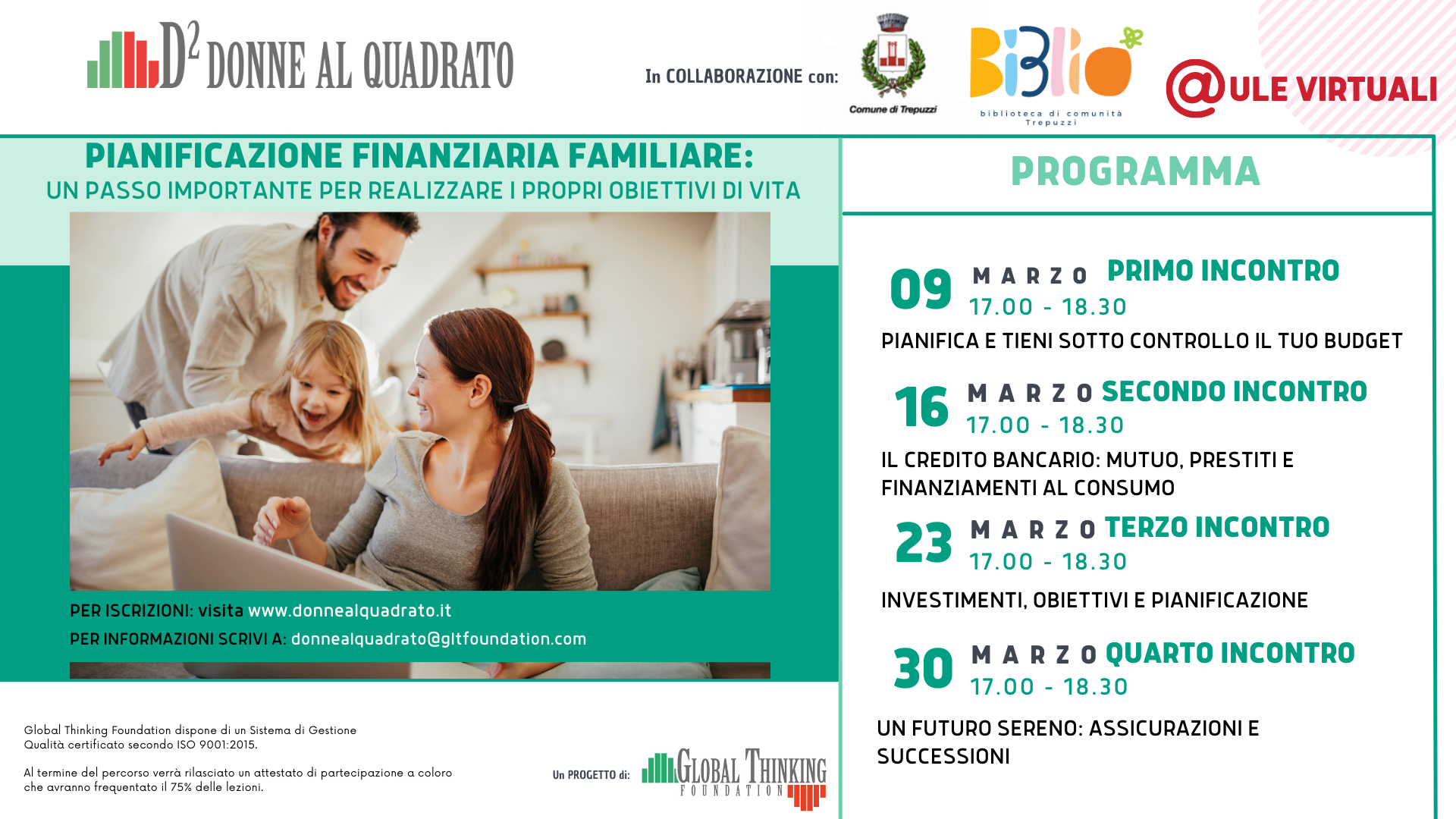 Nel modulo 1 del nostro corso si approfondirà la tematica sulla pianificazione finanziaria familiare. Come si tiene sotto controllo il budget? Come richiedere un mutuo o un prestito? Questi solo alcuni degli argomenti trattati che permetteranno di acquisire autonomia nella gestione delle proprie finanze, per un futuro più consapevole e sereno.