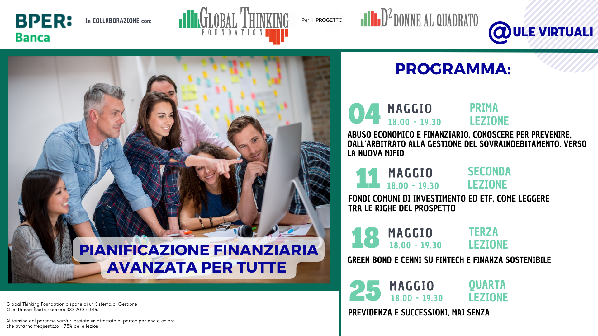 Un percorso di consapevolezza verso l’indipendenza economica che ha come obiettivo l’acquisizione di competenze economiche come: previdenza, green bon, finanza sostenibile, fondi comuni e molto altro.