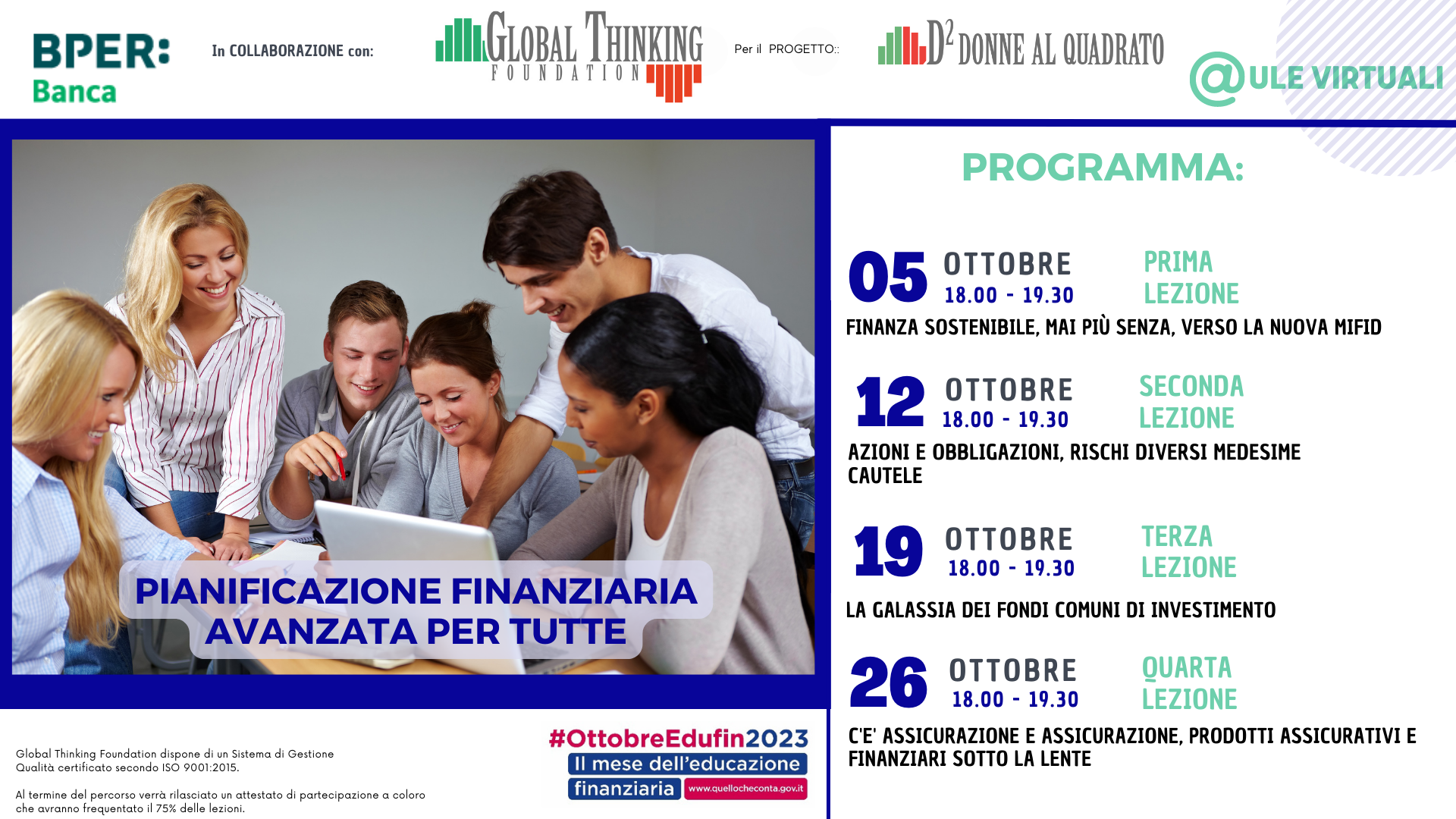 Un percorso di consapevolezza verso l’indipendenza economica che ha come obiettivo l’acquisizione di competenze economiche come: previdenza, green bon, finanza sostenibile, fondi comuni e molto altro.
