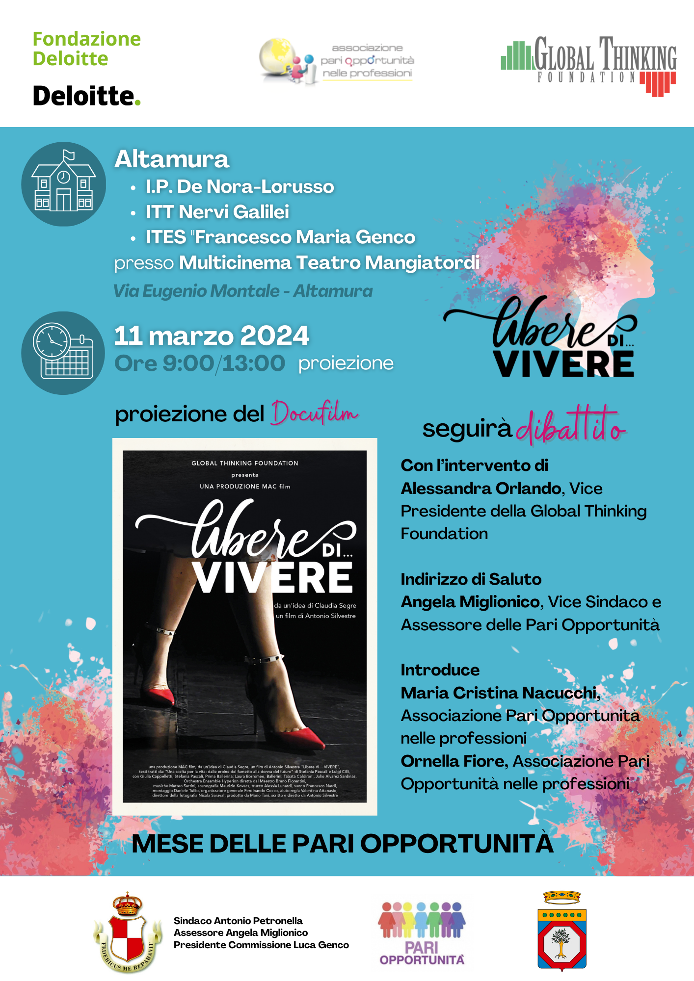Ad Altamura arriva la proiezione del docufilm Libere di... VIVERE per gli studenti delle scuole: I.P. De Nora-Lorusso, ITT Nervi Galilei ITES "Francesco Maria Genco presso Multicinema Teatro Mangiatordi. Seguirà dibattito con con l'intervento di Alessandra Orlando, VicePresidente della Global ThinkingFoundation, Maria Cristina Nacucchi e Ornella Fiore, Associazione Pari Opportunità nelle professioni.