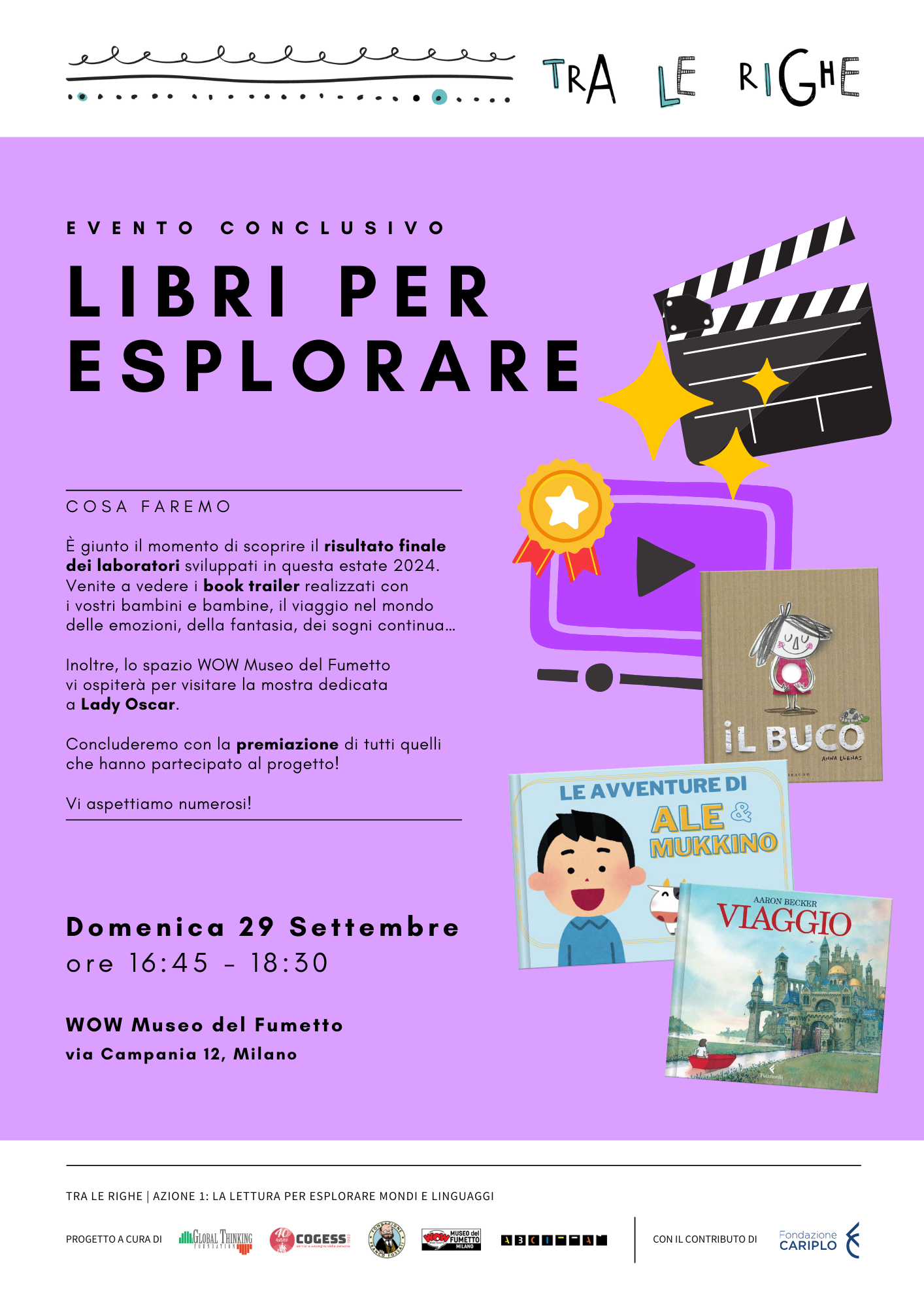 Per concludere i laboratori sviluppati in questa estate 2024, si terrà una festa in cui sarà possibile immergi in questa esperienza attraverso la visione dei book trailer realizzati con bambini e bambine che hanno partecipato al progetto. Inoltre, lo spazio WOW Museo del Fumetto terrà la mostra dedicata a Lady Oscar.