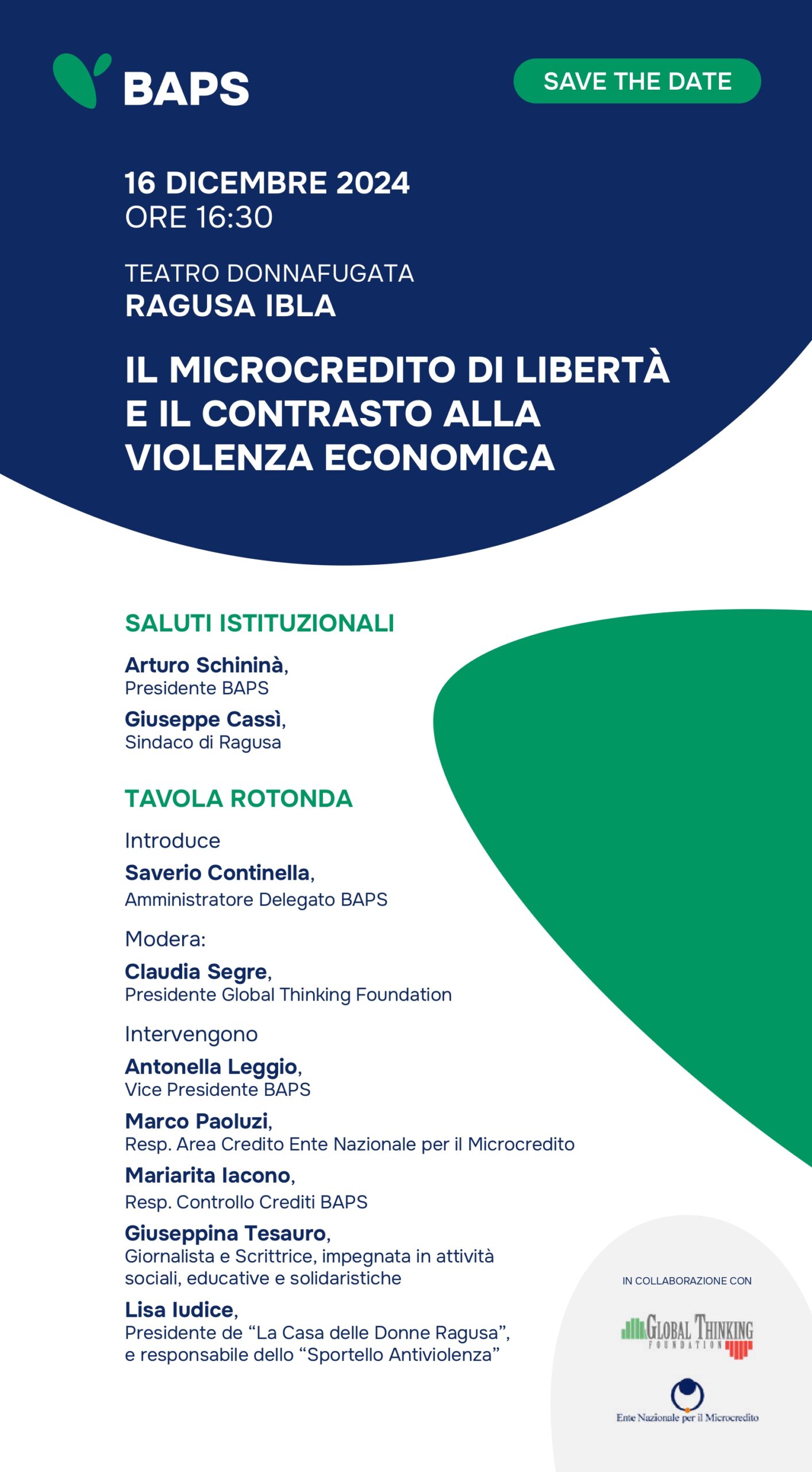 Un evento di BAPS, in collaborazione con Global Thinking Foundation, che affronta il tema della violenza economica e promuove il microcredito come strumento per aiutare le vittime a riconquistare l'indipendenza economica. Con la moderazione della nostra Presidente Claudia Segre.
