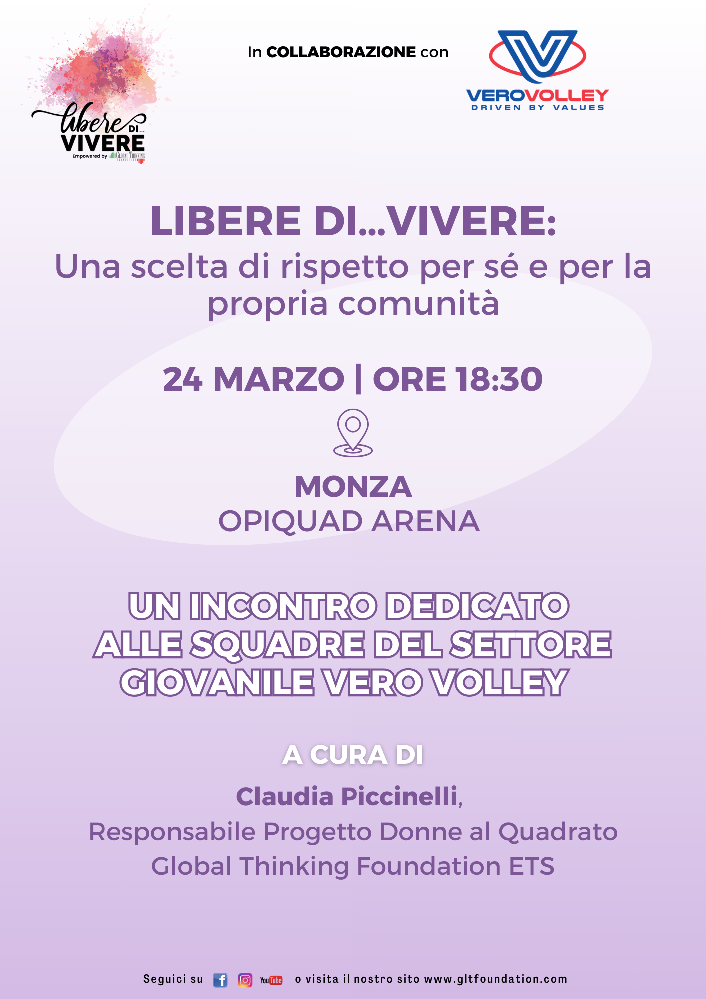 Un incontro del progetto Libere di...VIVERE, volto alla prevenzione e al contrasto della violenza economica, dedicato alle squadre del settore giovanile Vero Volley. Maggiori dettagli in locandina.