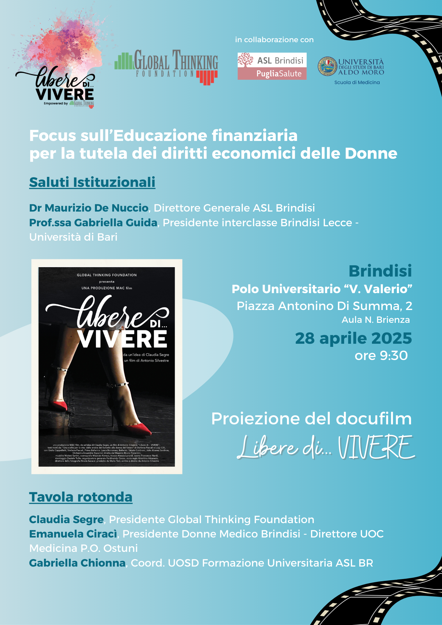 Un evento che vedrà la proiezione del docufilm "Libere di... VIVERE" che si pone come fine quello di sensibilizzare sul tema della violenza economica. Seguirà dibattito, con la presenza della nostra Presidente Claudia Segre, insieme a rappresentanti delle istituzioni e del mondo medico e giuridico, per promuovere un confronto costruttivo su prevenzione, consapevolezza e tutela dei diritti economici e finanziari delle donne.