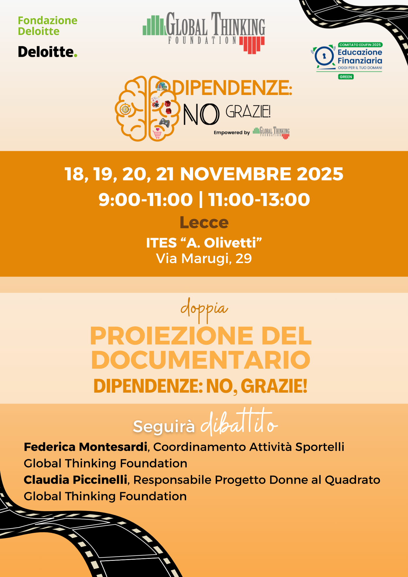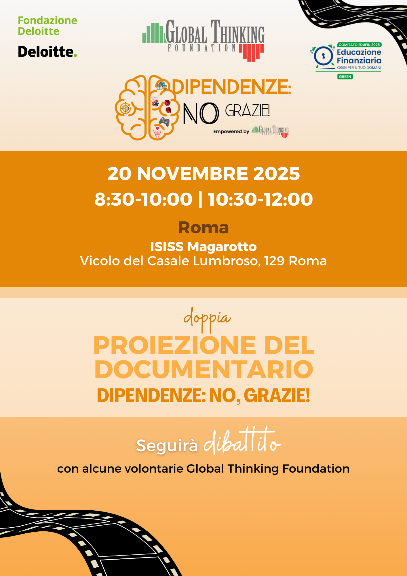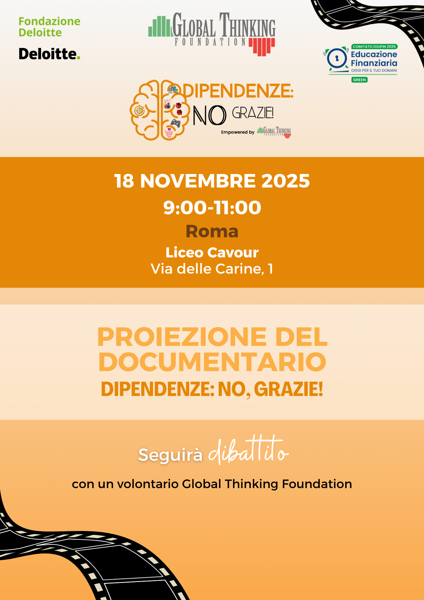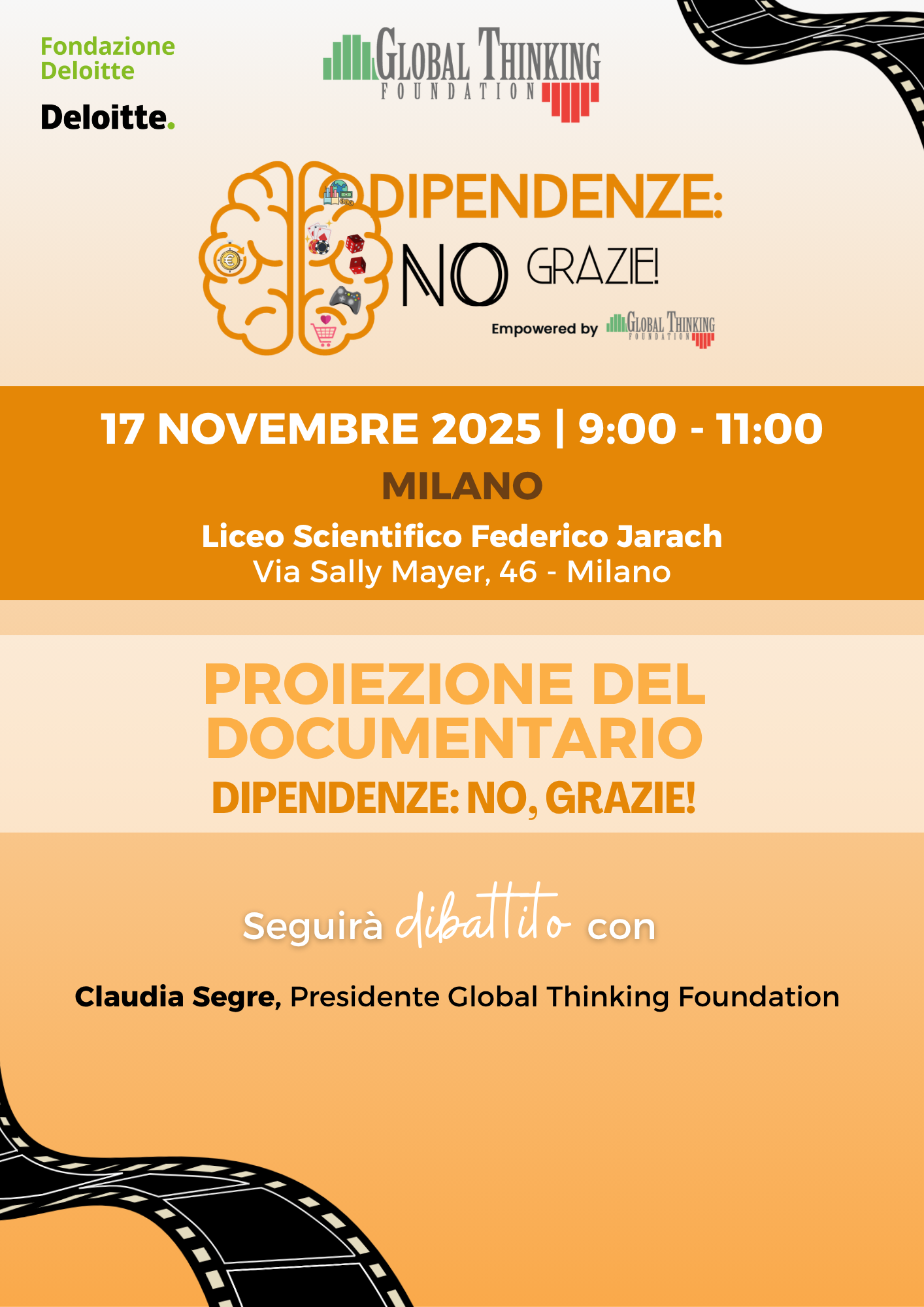 Proiezione del documentario Dipendenze: No, Grazie! - il progetto di Global Thinking Foundation volto al contrasto delle dipendenze senza sostanze, con particolare riferimento al gioco d’azzardo, al trading online e allo shopping compulsivo - per studenti e studentesse delle scuole superiori. Seguirà un dibattito di approfondimento su questi temi.