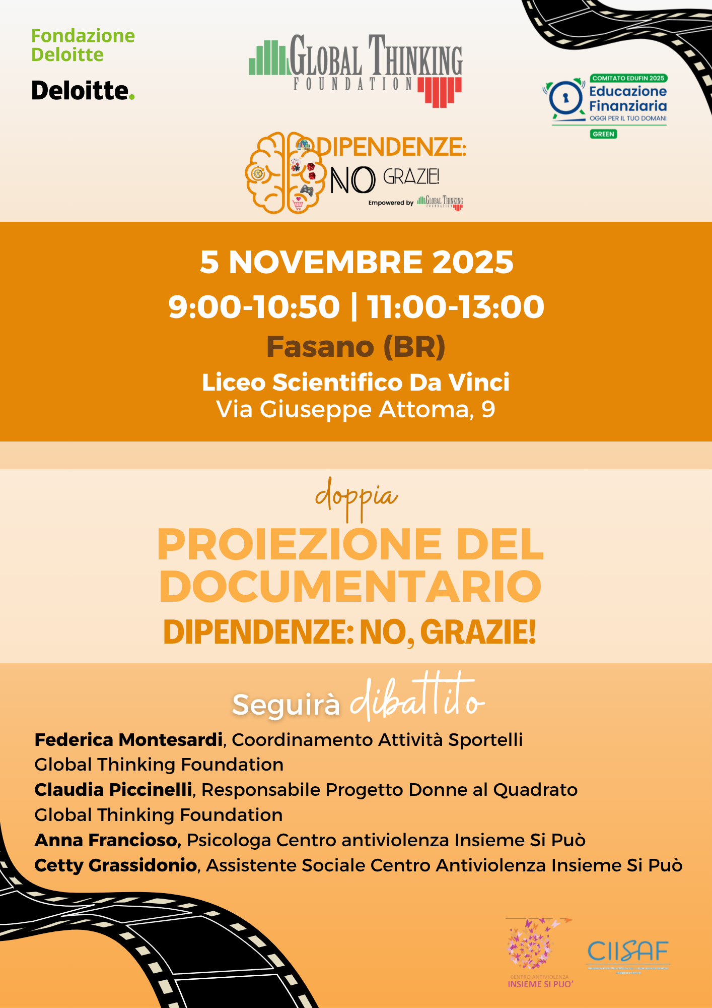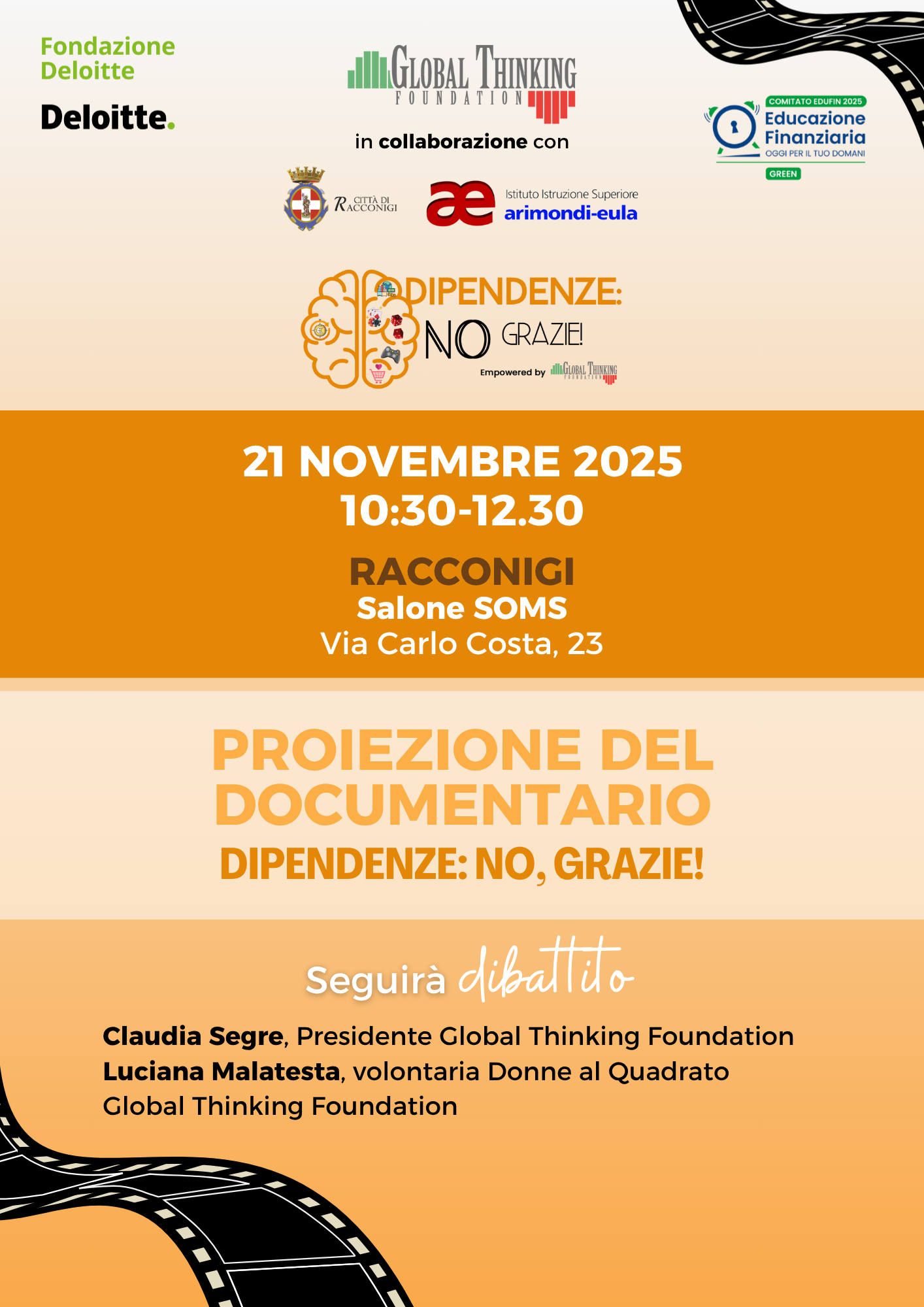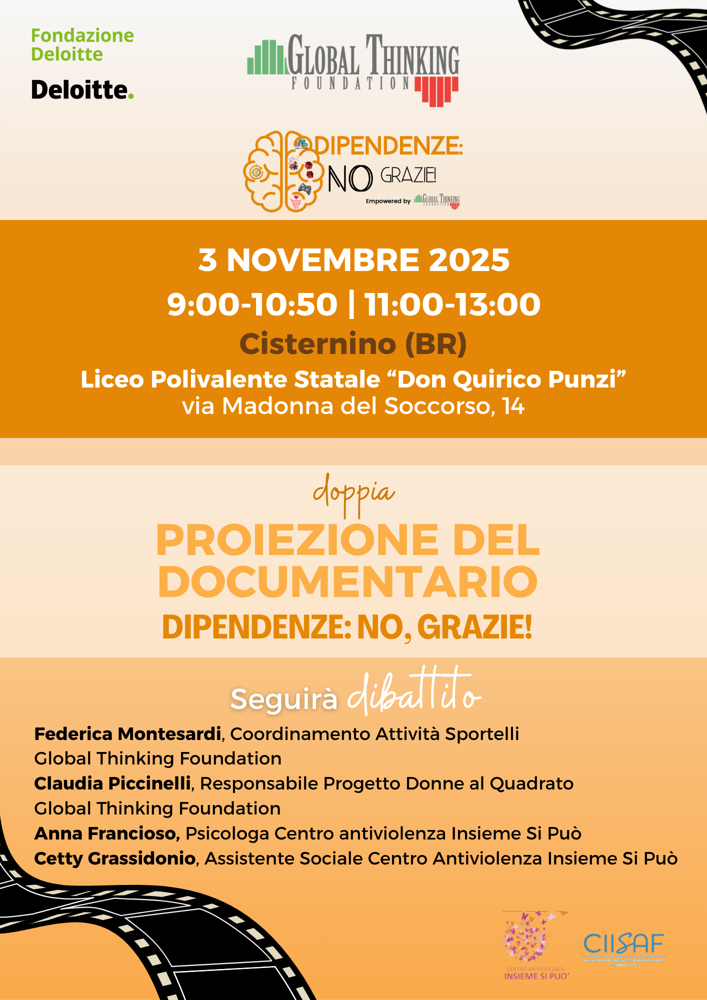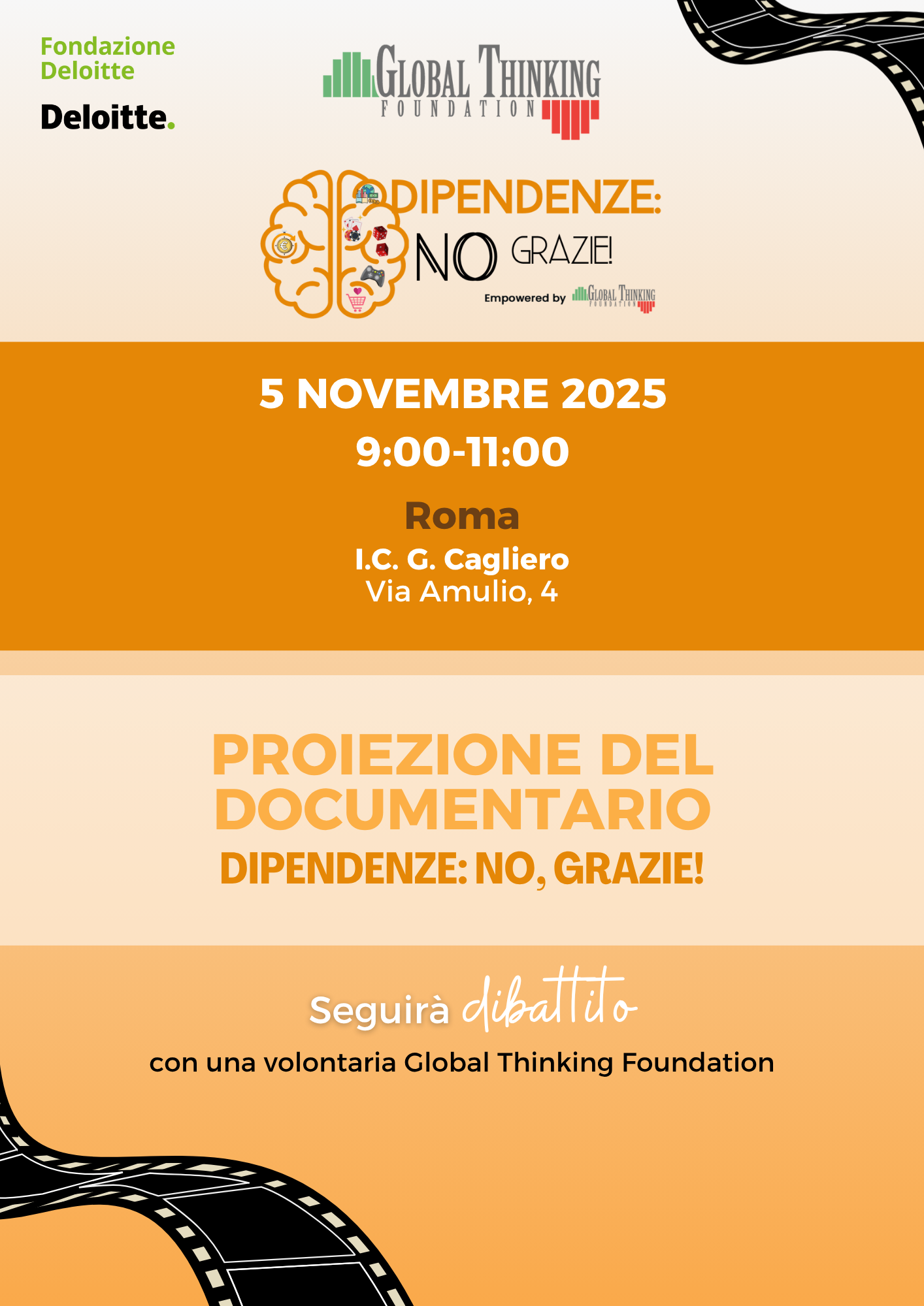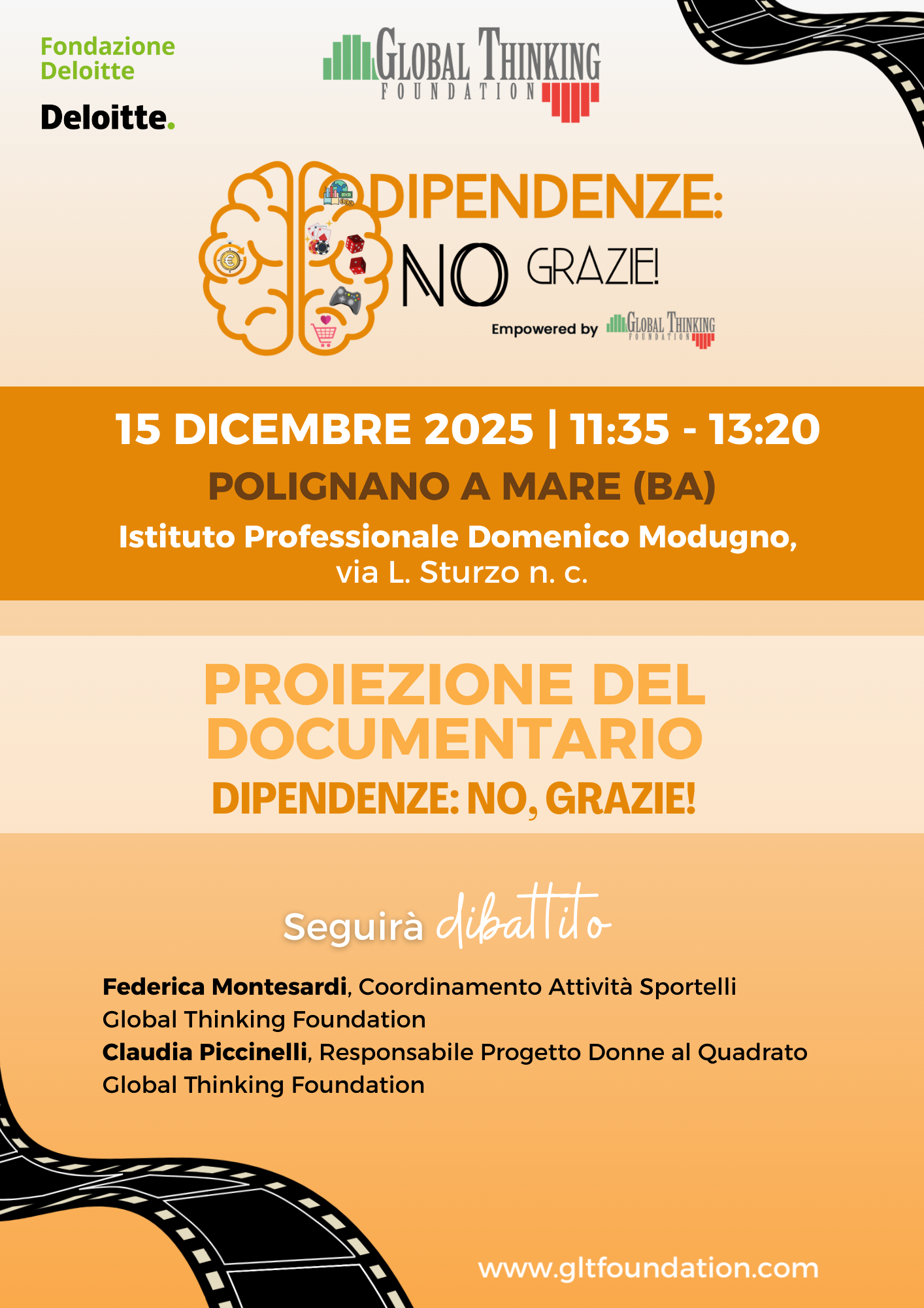 Proiezione del documentario Dipendenze: No, Grazie! - il progetto di Global Thinking Foundation volto al contrasto delle dipendenze senza sostanze, con particolare riferimento al gioco d’azzardo, al trading online e allo shopping compulsivo - per studenti e studentesse delle scuole superiori. Seguirà un dibattito di approfondimento su questi temi.