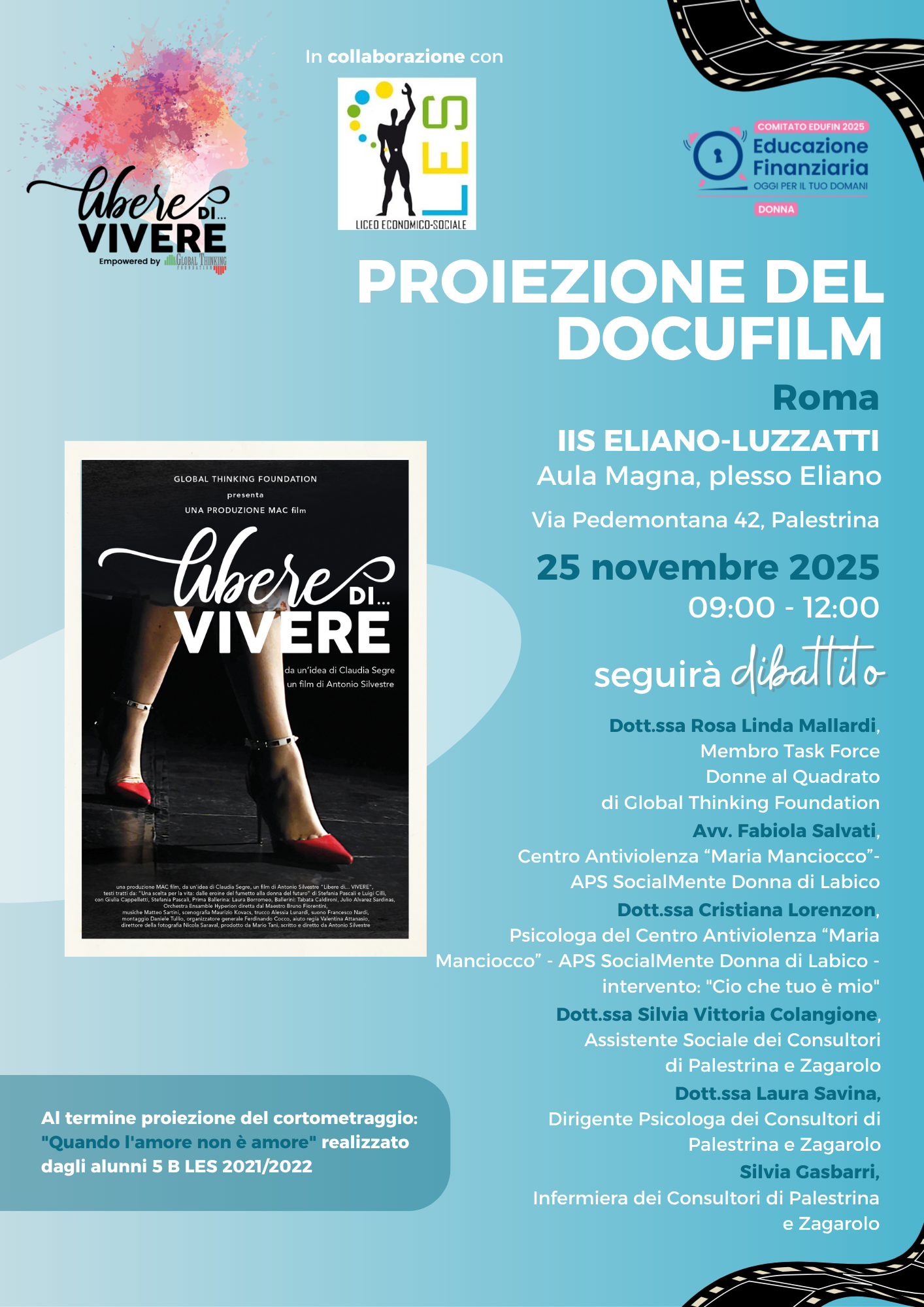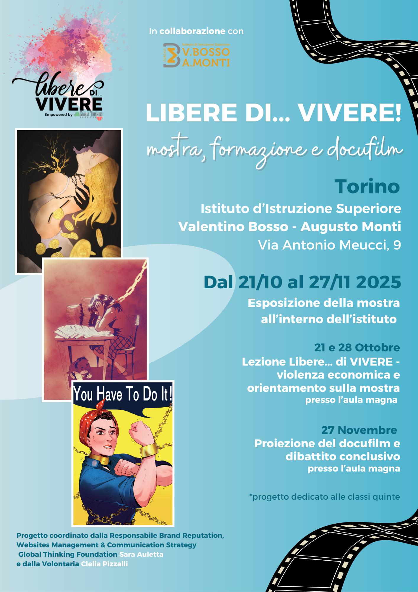 Si terrà, al Liceo Cavour di Roma, la proiezione del docufilm "Libere di... VIVERE", il progetto di Global Thinking Foundation che si occupa di sensibilizzare sul tema della violenza economica per promuoverne la prevenzione e il contrasto. Seguirà un dibattito, per studenti e studentesse, con una nostra volontaria, su questi temi.