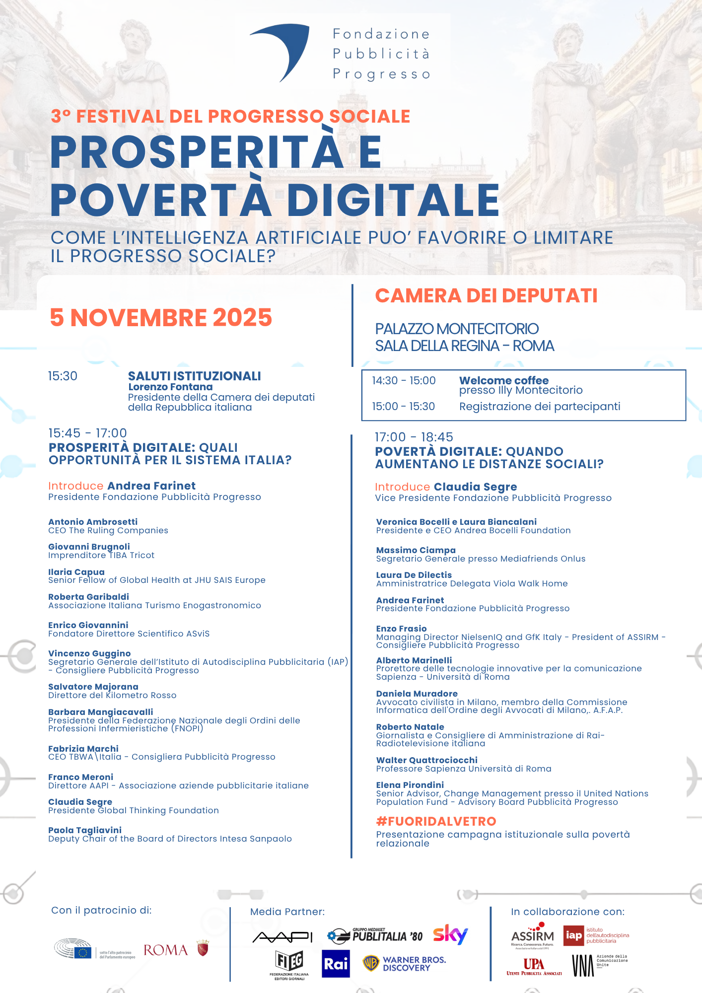 La nostra Presidente Claudia Segre, Vicepresidente di Fondazione Pubblicità Progresso, interverrà nel panel “Povertà digitale: quando aumentano le distanze sociali?”, portando il suo contributo sulle disuguaglianze economiche e digitali e sull’importanza dell’educazione finanziaria come leva di inclusione e cittadinanza consapevole nell’era dell’IA.