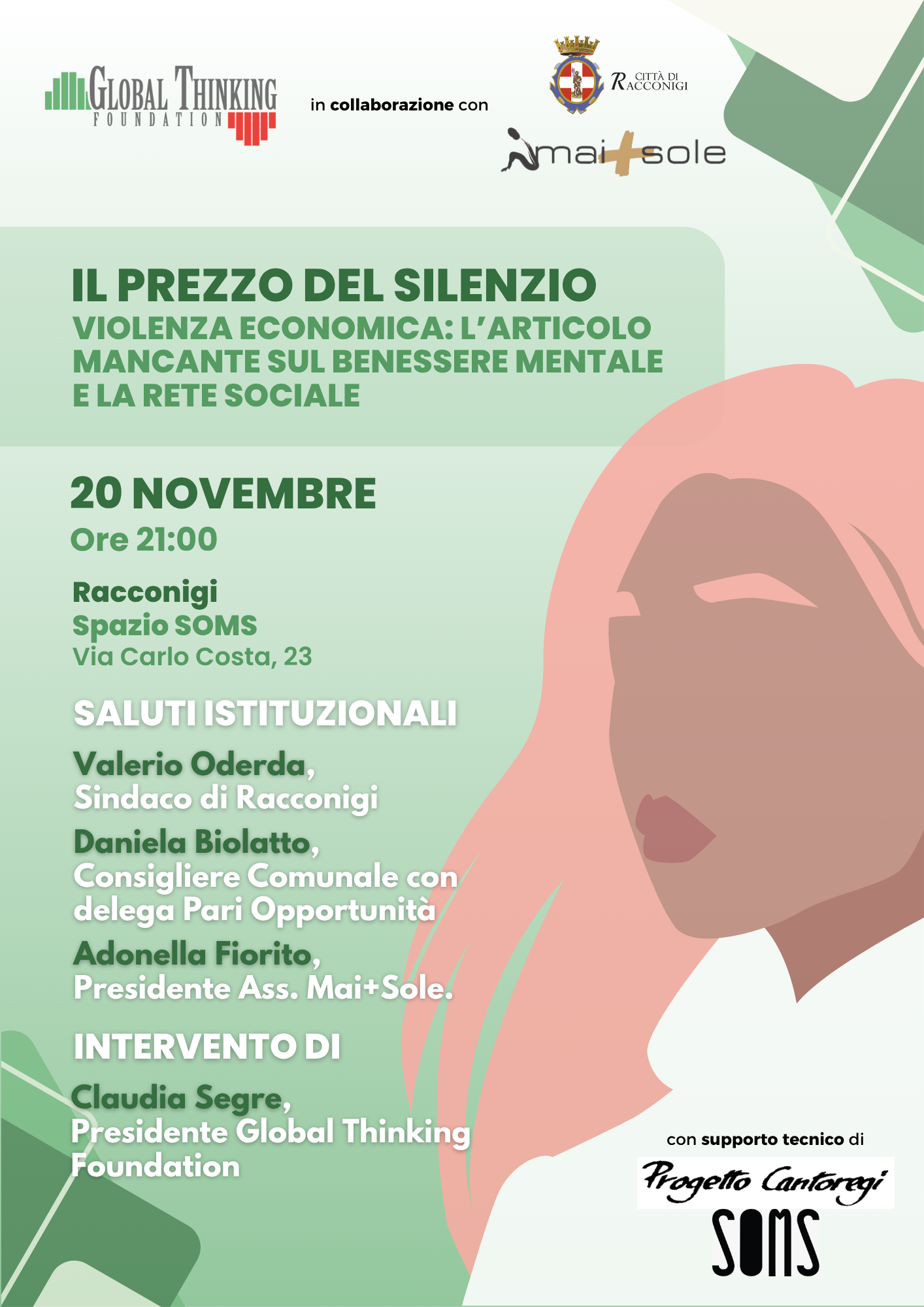 Global Thinking Foundation, in collaborazione con l’Associazione Mai+Sole e con il patrocinio della Città di Racconigi, promuove un incontro di sensibilizzazione dedicato al tema della violenza economica e al suo impatto sul benessere mentale e sulle relazioni sociali.