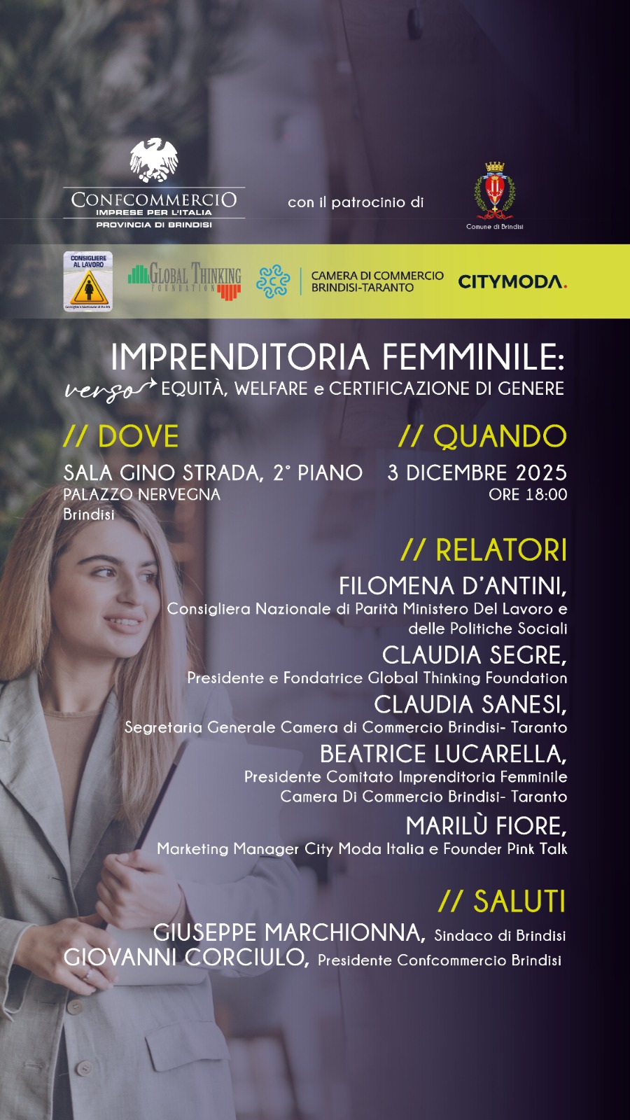 Confcommercio Brindisi - Taranto, con il patrocinio di Global Thinking Foundation e Citymoda è lieta di invitarvi all’incontro “Imprenditoria Femminile: verso equità, welfare e certificazione di genere”.
