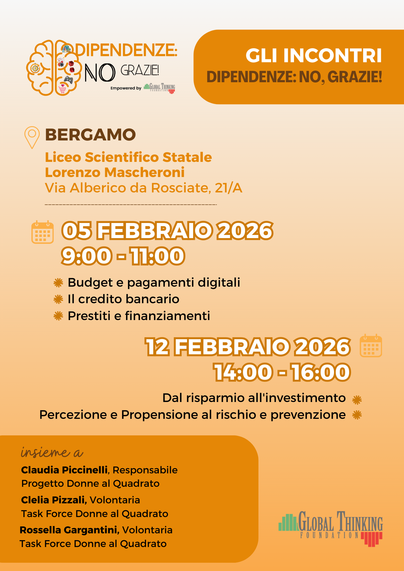 Il primo incontro affronterà i temi del budget e dei pagamenti digitali, del credito bancario, dei prestiti e dei finanziamenti; il secondo sarà invece dedicato al passaggio dal risparmio all’investimento, con un focus sulla percezione e sulla propensione al rischio, nonché sulla prevenzione.