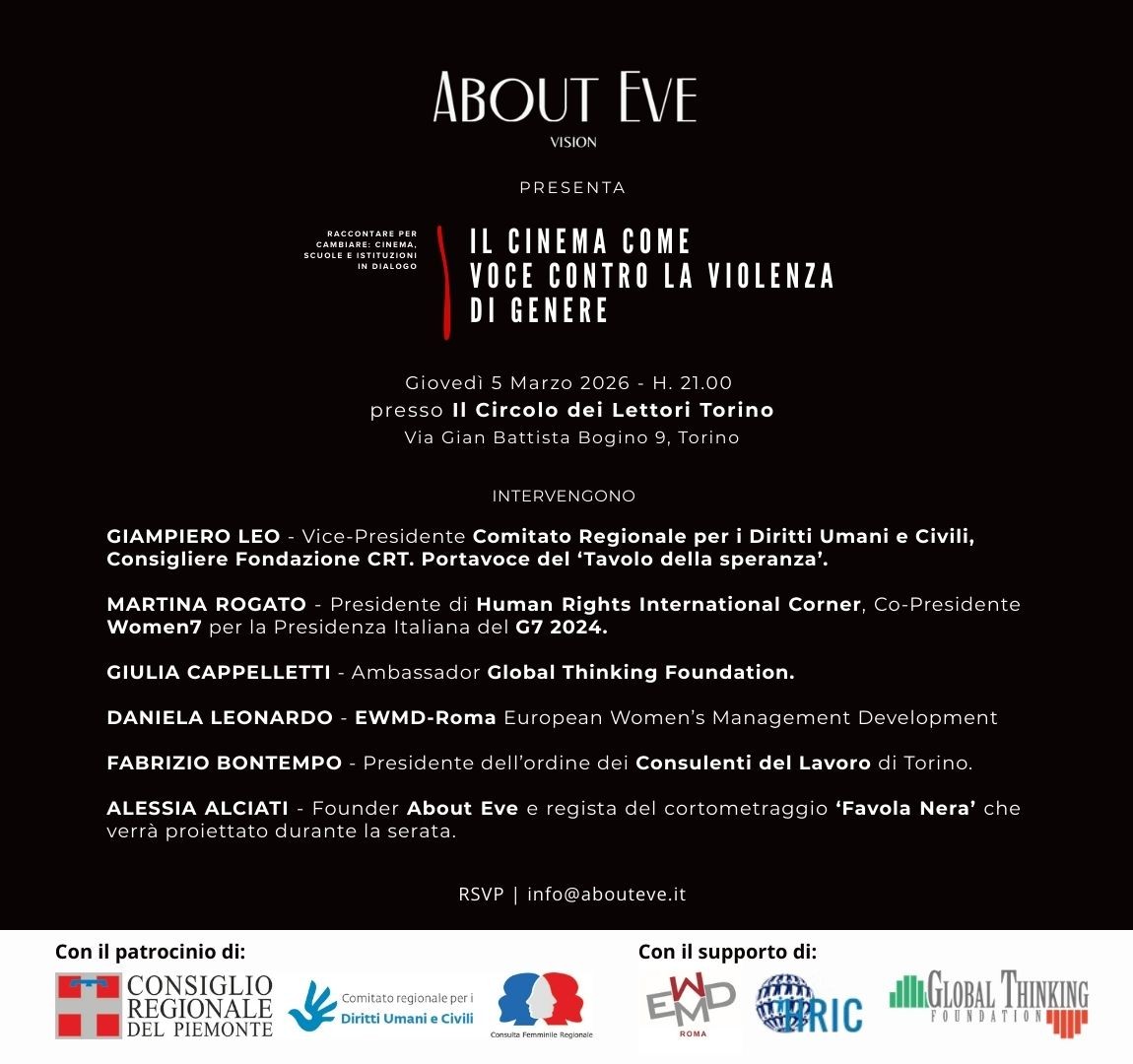 Il 5 marzo 2026, presso il Il Circolo dei Lettori di Torino, si terrà una serata dedicata al ruolo del cinema come strumento di sensibilizzazione e contrasto alla violenza di genere. L’evento prevede la proiezione del cortometraggio “Favola Nera” e un momento di confronto con rappresentanti del mondo istituzionale, dei diritti umani, delle organizzazioni internazionali, delle professioni e dell’associazionismo impegnato nella promozione della parità di genere.