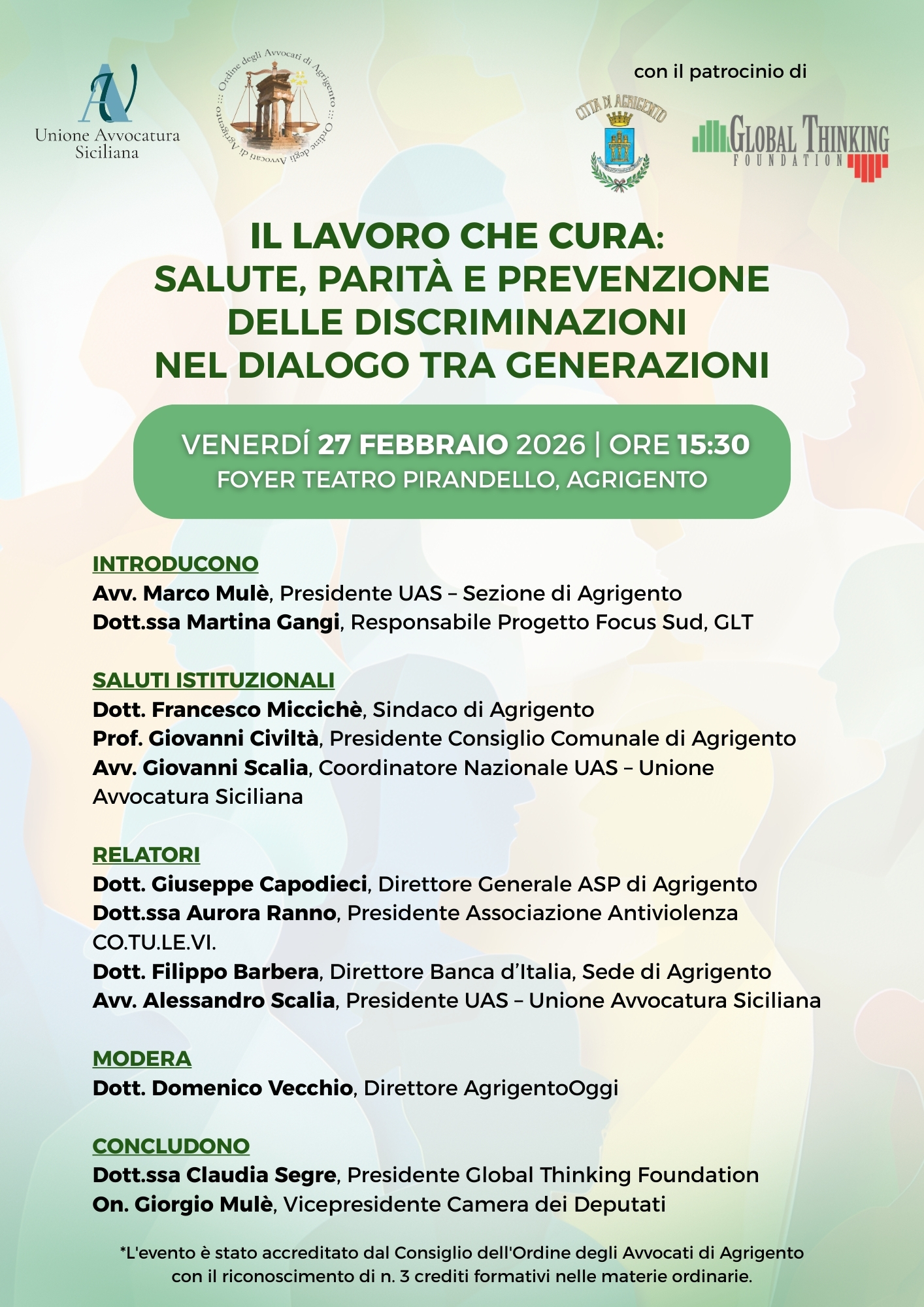 Si terrà ad Agrigento l’evento promosso da Unione Avvocatura Siciliana e Global Thinking Foundation.