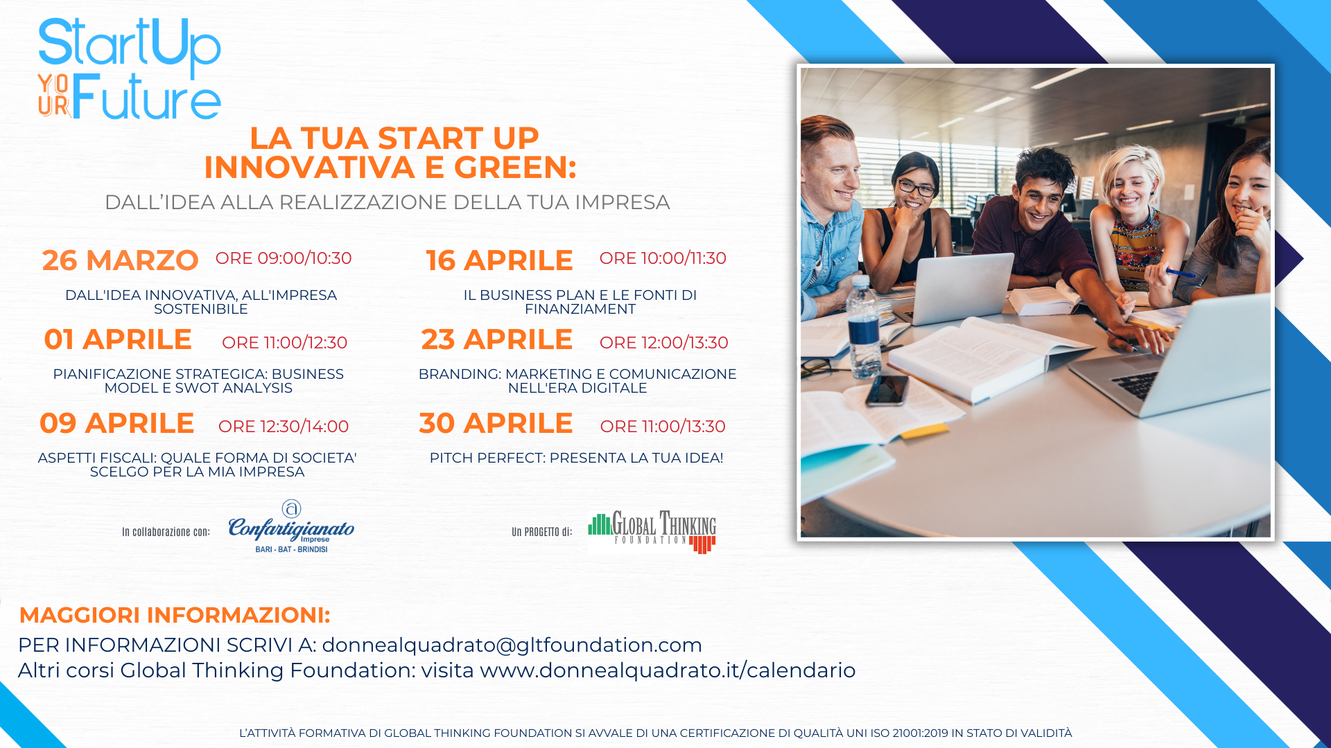 Il nuovo corso StartUp Your Future - La Tua Startup Innovativa e Green di GLT Foundation, dedicata ai ragazzi, in collaborazione con Confartigianato Imprese Bari - Bat - Brindisi, offre un’introduzione alle principali sfide e opportunità legate all’avvio di una nuova impresa o progetto professionale. Attraverso un approccio pratico verranno affrontati gli elementi fondamentali per pianificare e sviluppare un’idea imprenditoriale: dall’analisi di fattibilità alla definizione del business plan, dagli aspetti economici, legali e fiscali alle strategie organizzative e di marketing. Saranno inoltre presentate le principali fonti di finanziamento e gli strumenti utili per promuovere e realizzare con successo il proprio progetto.