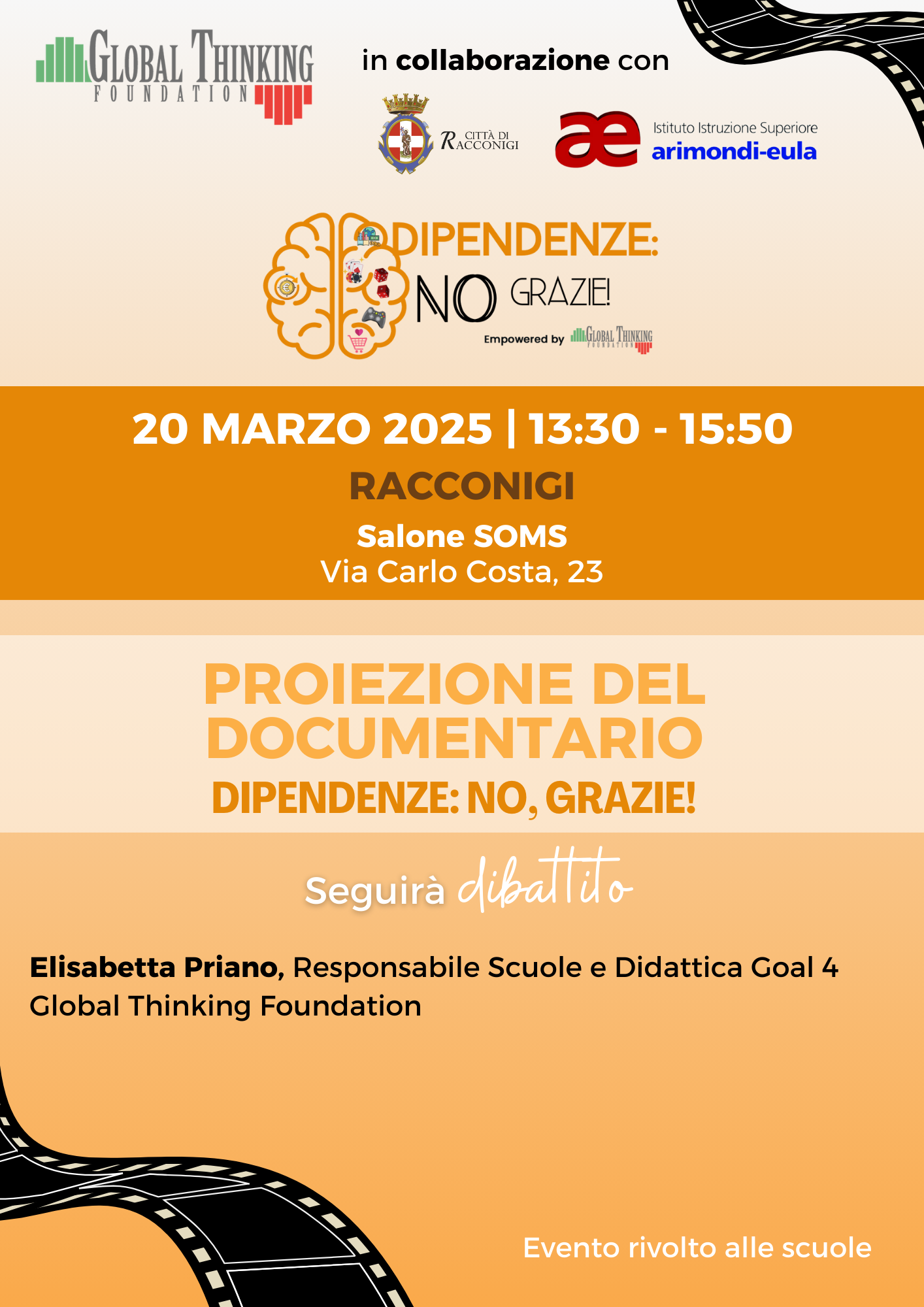 In questo evento si tratteranno tematiche legate alle dipendenze comportamentali, quindi senza sostanza. Si terrà la proiezione del documentario "Dipendeze: No, Grazie!" prodotto da Globahl Thinking Foundation ed un dibattito finale con Elisabetta Priano, Responsabile Scuole e Didattica Goal 4 Global Thinking Foundation.