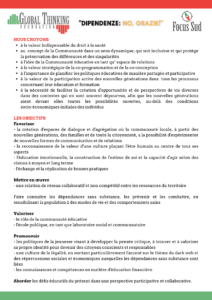 La publication est le résultat de la collaboration entre la Global Thinking Foundation et l’Université de Palerme et est basée sur les résultats du projet Dipendenze: NO, GRAZIE! Outre la publication disponible dans la série La Piega, éditée par Martina Gangi (responsable du projet Focus Sud) et Giorgia Coppola, deux bourses ont été attribuées pour des travaux sur l’analyse de l’impact social.