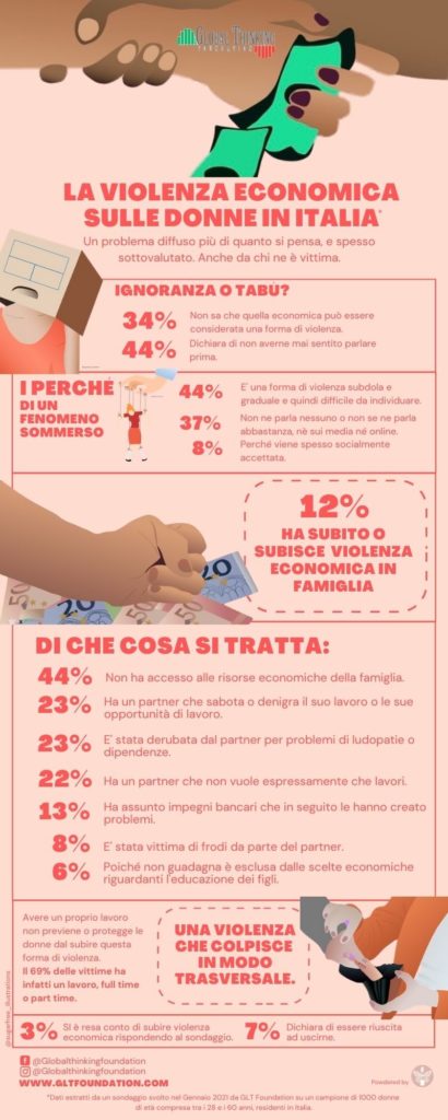 Rafforzano il nostro impegno perché anche in Italia si possa arrivare a comprendere il fenomeno della violenza economica nella sua gravità economica e sociale. Quando parliamo di violenza e abuso relazionale, in genere ci concentriamo sul maltrattamento fisico ed emotivo. L’abuso o il controllo finanziario da parte di un partner intimo, interessa 99% dei casi di violenza domestica.