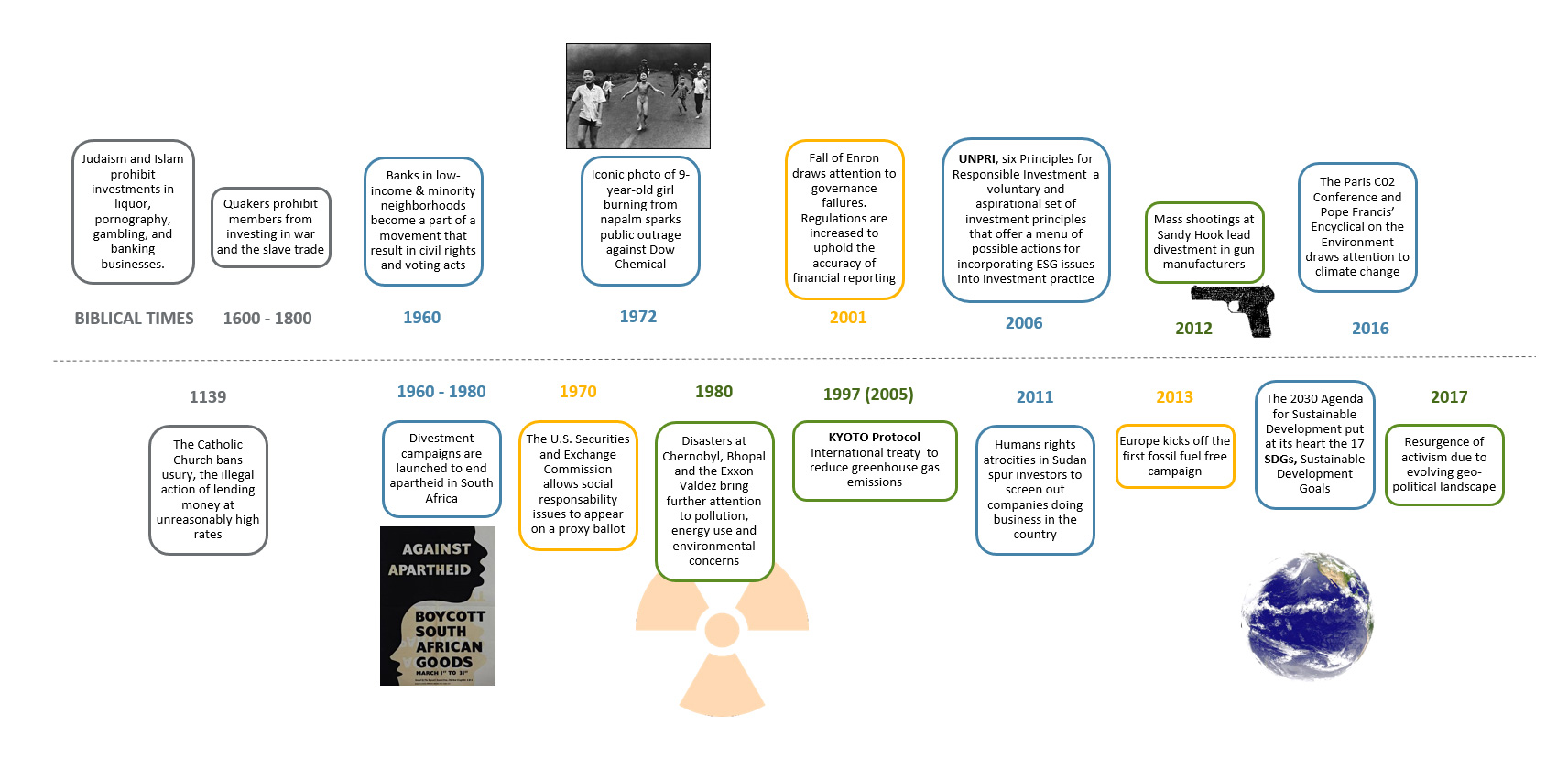 L’importanza di un approccio responsabile agli investimenti fonda le sue radici ben prima del nuovo millennio. Sin dai tempi biblici alcune religioni introducono il divieto di investire in attività considerate non etiche, come alcol, scommesse, pornografia e tabacco, aprendo la strada a quello che adesso chiamiamo approccio SRI, Social Responsible Investing. Sempre di matrice religiosa la condanna della Chiesa medioevale nei confronti dell’usura, sancita dal Secondo Concilio Lateranense nel 1139 e, a partire dalla metà del 1600, il movimento dei quaccheri, nome con cui è conosciuta la Società degli Amici, contro la guerra e la schiavitù. I quaccheri furono la prima comunità cristiana a contrastare la tratta degli schiavi, gettando le basi per un cambiamento della coscienza collettiva culminato all’inizio del 1800 con lo sviluppo dell’abolizionismo. Nel XX secolo, dopo la grande guerra, diversi movimenti per i diritti umani e contro la guerra guidano passi importanti per lo sviluppo sociale ed economico. La storia politica del Sudafrica offre un esempio suggestivo dell’uso del disinvestimento come arma efficace per mobilitare il cambiamento sociale.  A partire dagli anni ’60, le proteste guidate dagli studenti sudafricani e americani – che chiedono alle loro università e alle istituzioni di uscire dai business e dalle attività legate al governo sudafricano sostenitore dell’apartheid – generano una mobilitazione di massa che porterà nell’84 all’avvio della revisione dell’apartheid, conclusosi nel ’91 dopo la liberazione di Nelson Mandela. Il 1900 va anche ricordato come il secolo del riconoscimento, almeno formale, di pari diritti per le donne rispetto agli uomini. Una rivoluzione che avuto il suo apice negli anni ’70, aprendo la strada a una maggiore inclusione sociale ed economica delle donne. Tema ancora di grande attualità, ampliato in questo nuovo secolo alla “gender equality”, uno dei 17 SDG, obiettivi su cui lavorare per l’Agenda per uno sviluppo sostenibile. Sempre all’inizio degli anni 70’ le crisi petrolifere accendono i riflettori sui rischi ambientali e sulla necessità di limitare gli sprechi per garantire la sostenibilità delle risorse naturali. Sono diversi i movimenti ecologisti e le campagne contro l’inquinamento, ma ci sono voluti una serie di disastri ambientali negli anni ‘80, come lo scoppio del reattore nucleare di Chernobyl, il disastro chimico a Bhopal, l’incidente della petroliera Exxon Valdez in Alaska, per mettere la E di Environment al centro dell’opinione pubblica e arrivare nel 1997 al protocollo di Kyoto, trattato internazionale in materia ambientale riguardante il surriscaldamento globale. Accordo entrato in vigore nel 2005, ratificato da 191 Paesi, tra cui però mancano ancora Stati Uniti e paesi in via di sviluppo come Cina, India e Brasile. Anche il  Climate action fa parte degli SDG ed è diventata una delle grandi sfide del nuovo Millennio. L’approccio ESG nasce proprio negli anni 2000 per ampliare il tema degli investimenti socialmente responsabili, fino a quel momento perseguiti con l’esclusione di alcune industry/settori dall’universo investibile, a un visione olistica dei fattori ambientali, sociali e di governance che cominciano a essere integrati a diversi livelli. Nel 2006 le Nazioni Unite lanciano i PRI, Principle fpr Responsible Investiment, con l’intento di favorire la diffusione dell’investimento sostenibile e responsabile tra gli investitori istituzionali, che sono chiamati a sottoscrivere e rispettare l’applicazione degli stessi. Da allora i firmatari sono oltre 1200 tra investitori, società di gestione del risparmio e fornitori di servizi e si sono impegnati a incorporare le tematiche ESG nell’analisi e nei processi di investimento, nelle proprie politiche e pratiche aziendali, nel ricercare trasparenza su questi fattori nelle controparti, nel promuovere la responsabilità sociale nell’industria, nel cooperare su questo fronte e documentare le attività e i progressi. L’attenzione sulla corporate governance diventa negli stessi anni un fattore chiave per limitare i rischi economici e reputazionali, emersi durante e dopo le crisi e gli scandali finanziari a cui abbiamo assistito dall’inizio del Nuovo Millennio. L’engagement e la stewardship degli investitori nei confronti delle società sta cambiando il modus operandi di diversi settori chiamati a rispondere ad esigenze di innovazione e ricerca coerenti con uno sviluppo sostenibile. Una storia lunga, dunque, quella dell’universo ESG che nel 2015 ha compiuto un nuovo passo, con la definizione degli SDG, Sustainable Development Goals: dalla adesione ai 6 principi all’approvazione dell’Agenda 2030 per uno sviluppo sostenibile, il cui fulcro è il perseguimento di 17 obiettivi che mirano a disegnare un futuro migliore e più sostenibile.