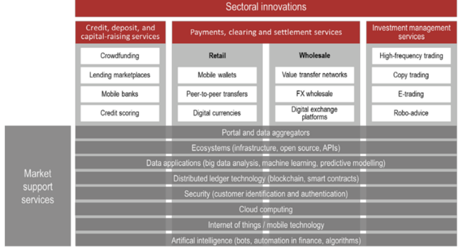 Fintech investe potenzialmente ogni segmento dei mercati dei servizi bancari e finanziari, e ne modifica la struttura attraverso l’ingresso di start-up tecnologiche ma anche dei giganti dei social media e della tecnologia informatica come Google, Apple, Facebook, Amazon, Alibaba etc. (c.d. Bigtech)